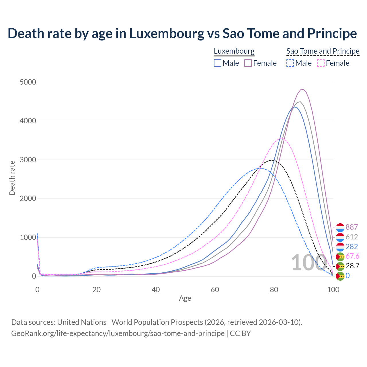 In Luxembourg, the most common age of death is 89, compared to 79 in Sao Tome and Principe. The median age of death is 85.7 in Luxembourg and 74.1 in Sao Tome and Principe, meaning only half of each cohort is expected to live past that age.