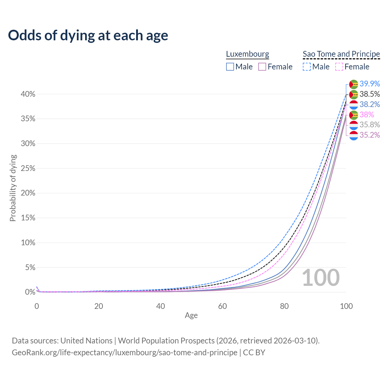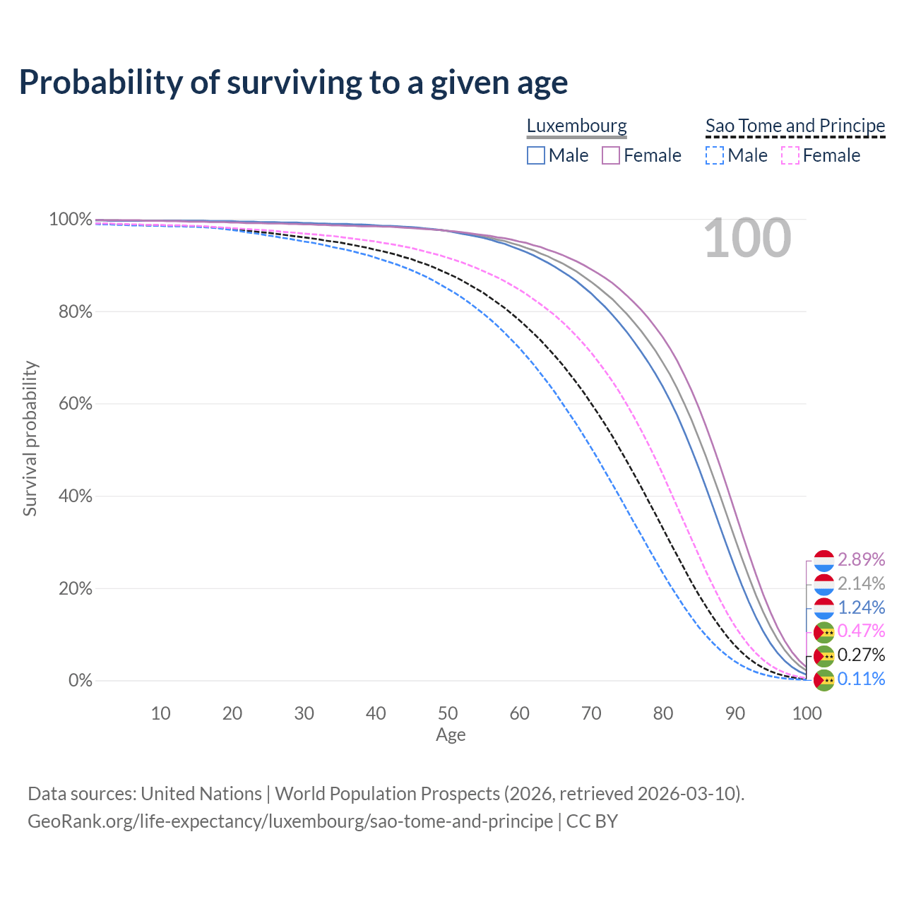 This life expectancy calculator shows the odds of living to 100, 95, 90, and below based on current age for both males and females in Luxembourg and Sao Tome and Principe, along with mean and median age of death. The calculations are based on the 2026 life tables (actuarial tables) from the UN World Population Prospects.