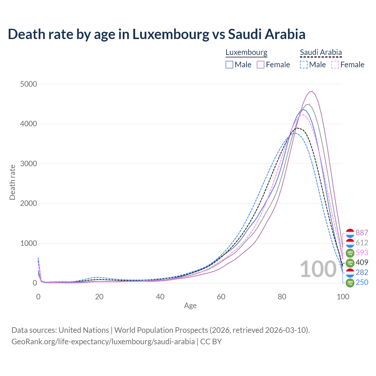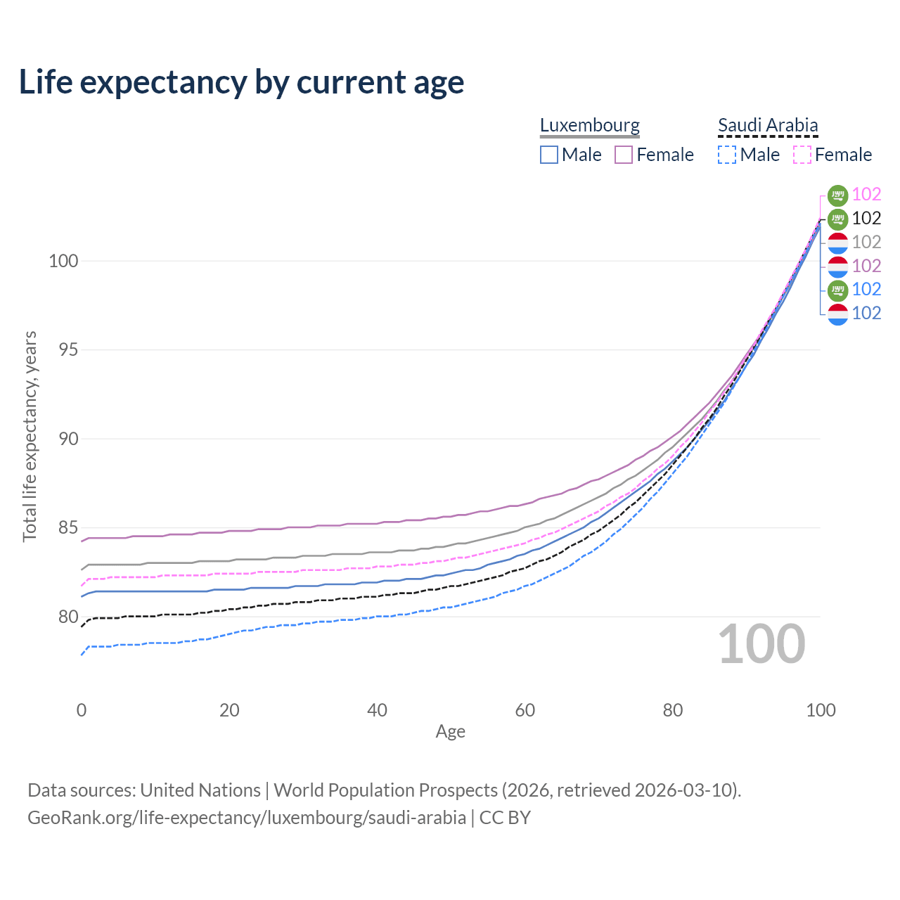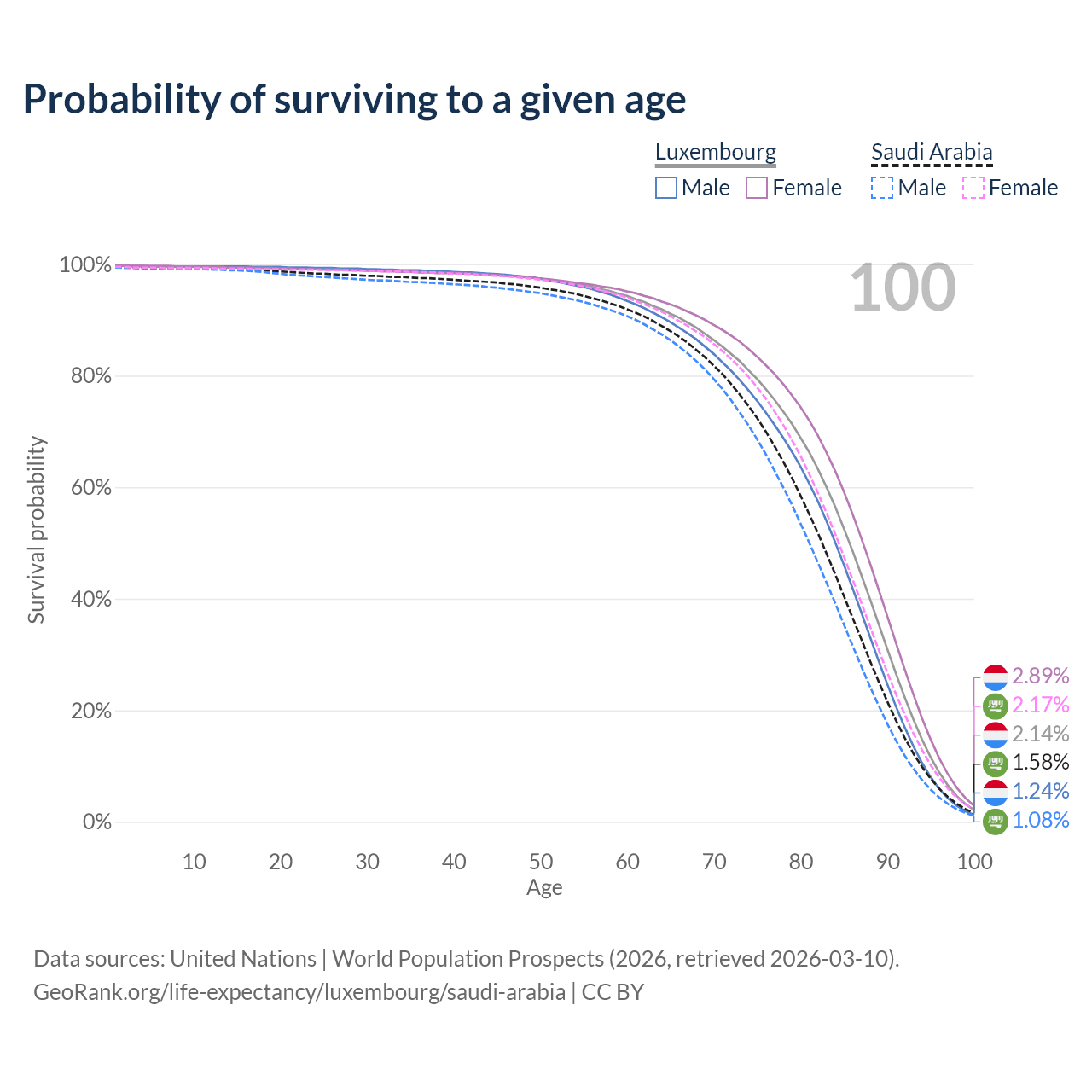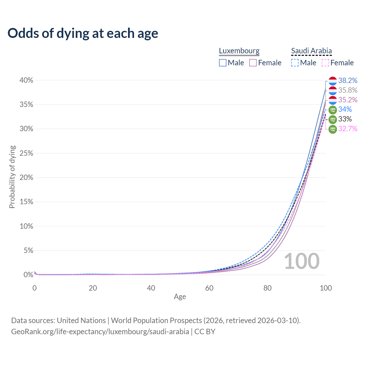 This life expectancy calculator shows the odds of living to 100, 95, 90, and below based on current age for both males and females in Luxembourg and Saudi Arabia, along with mean and median age of death. The calculations are based on the 2026 life tables (actuarial tables) from the UN World Population Prospects.