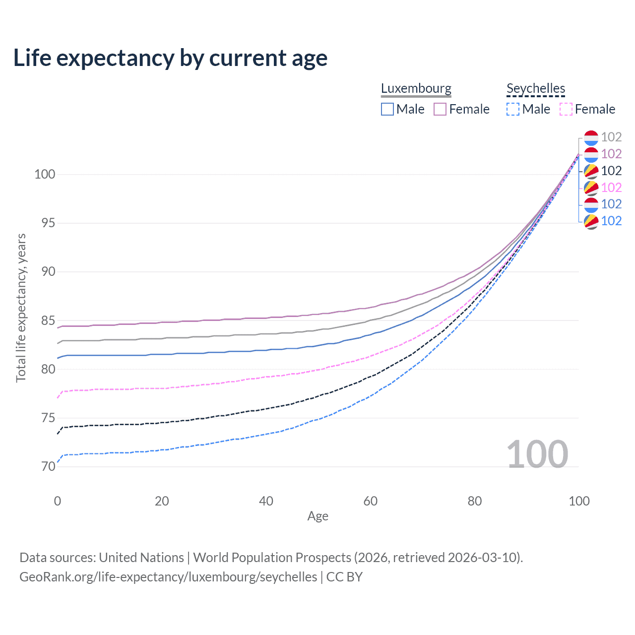 This life expectancy calculator shows the odds of living to 100, 95, 90, and below based on current age for both males and females in Luxembourg and the Seychelles, along with mean and median age of death. The calculations are based on the 2026 life tables (actuarial tables) from the UN World Population Prospects.
