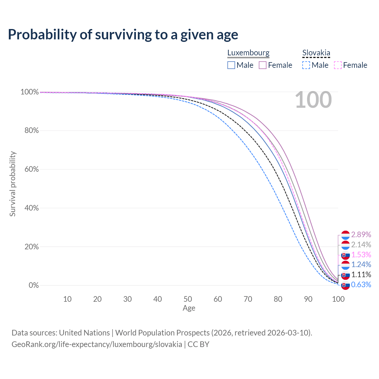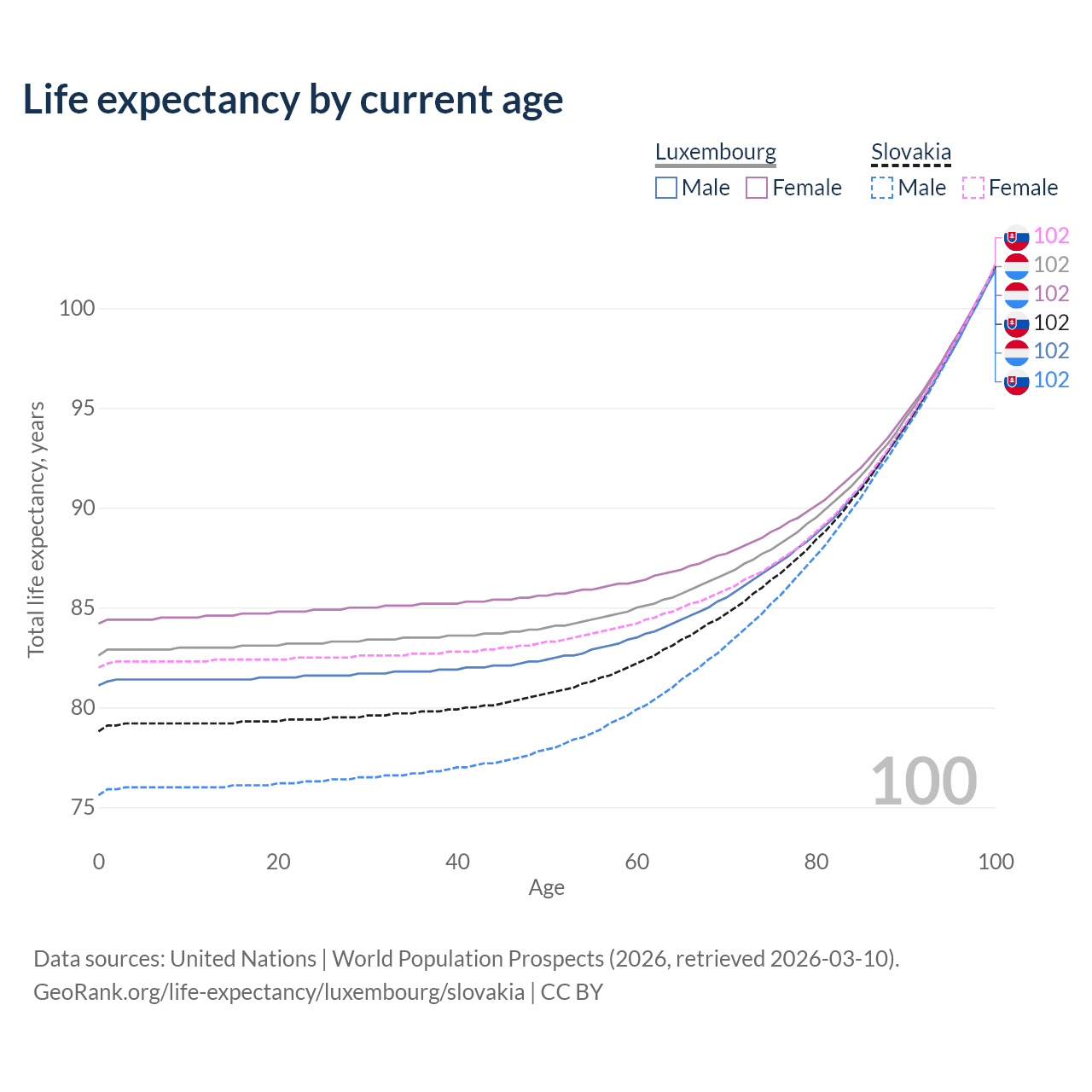 This life expectancy calculator shows the odds of living to 100, 95, 90, and below based on current age for both males and females in Luxembourg and Slovakia, along with mean and median age of death. The calculations are based on the 2026 life tables (actuarial tables) from the UN World Population Prospects.