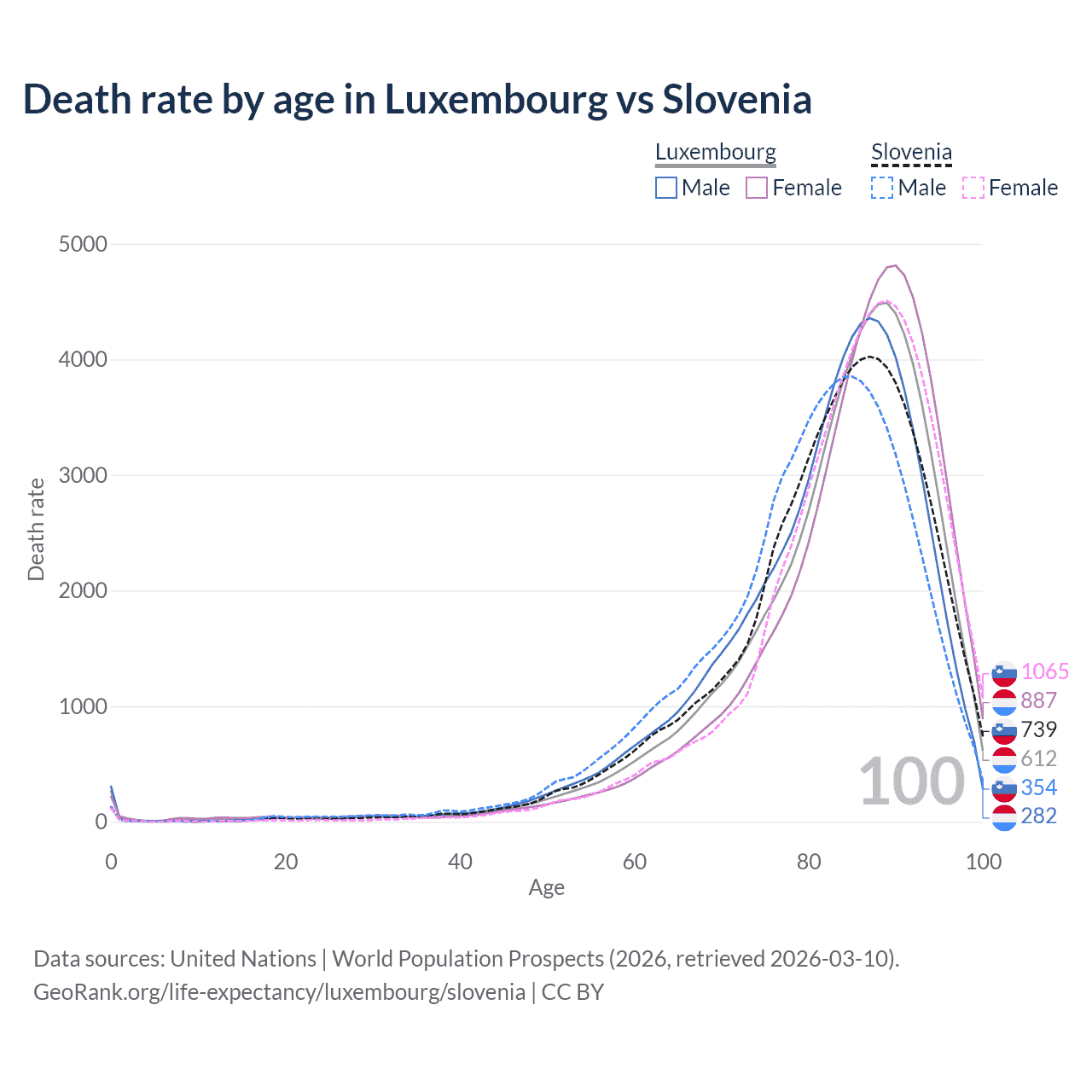 This life expectancy calculator shows the odds of living to 100, 95, 90, and below based on current age for both males and females in Luxembourg and Slovenia, along with mean and median age of death. The calculations are based on the 2026 life tables (actuarial tables) from the UN World Population Prospects.