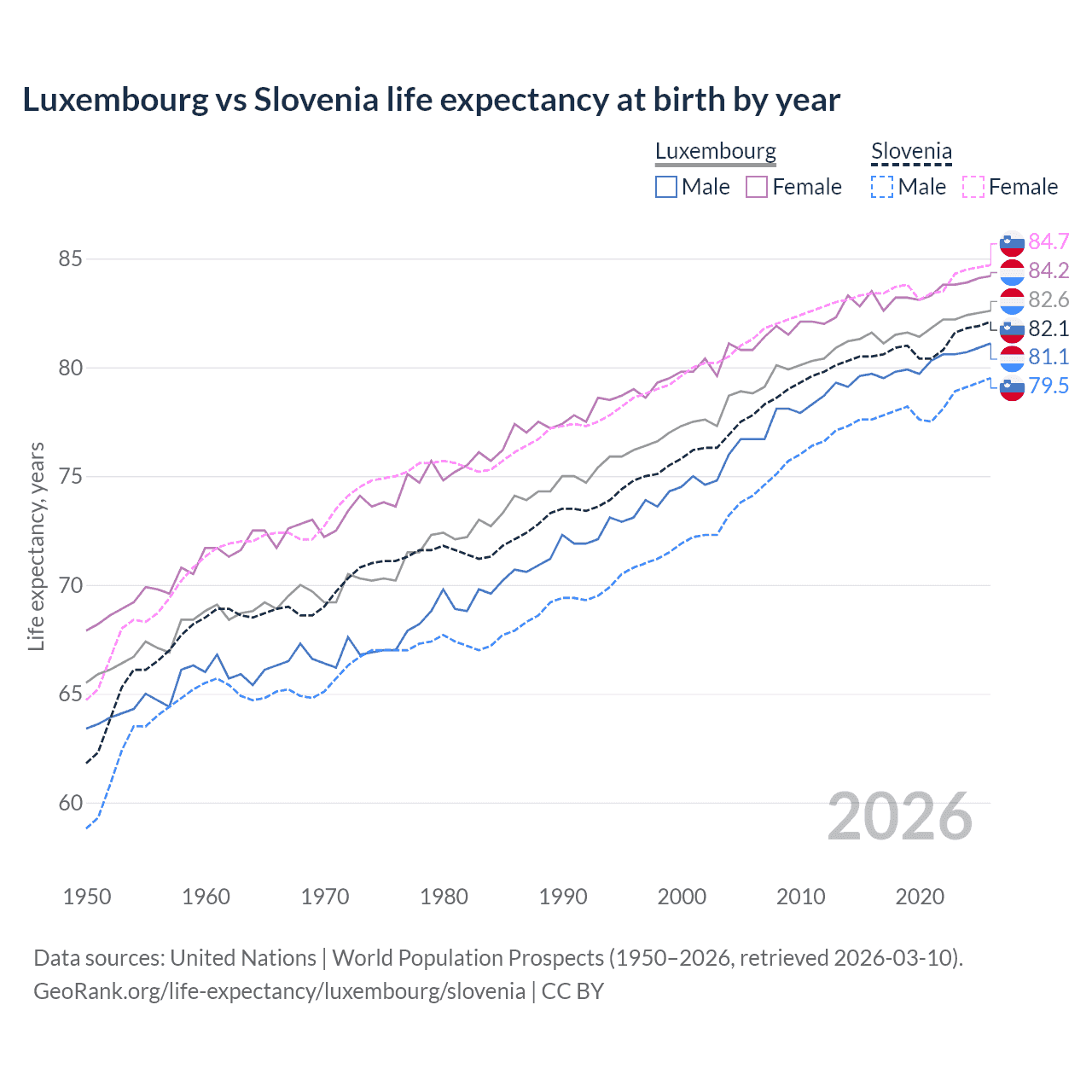 The average life expectancy at birth is 82.6 years in Luxembourg vs 82.1 in Slovenia. Luxembourg is ranked 24/197 by life expectancy, and Slovenia is 33/197. In Luxembourg, the life expectancy is 81.1 years for males and 84.2 years for females. In Slovenia, it's 79.5 years for males and 84.7 years for females.