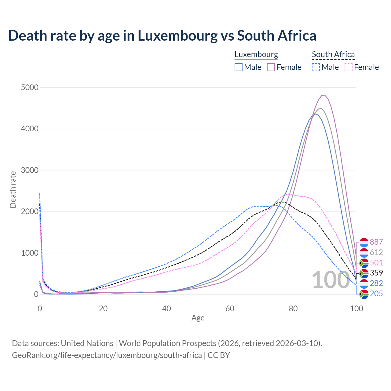 In Luxembourg, the most common age of death is 89, compared to 77 in South Africa. The median age of death is 85.7 in Luxembourg and 70.8 in South Africa, meaning only half of each cohort is expected to live past that age.