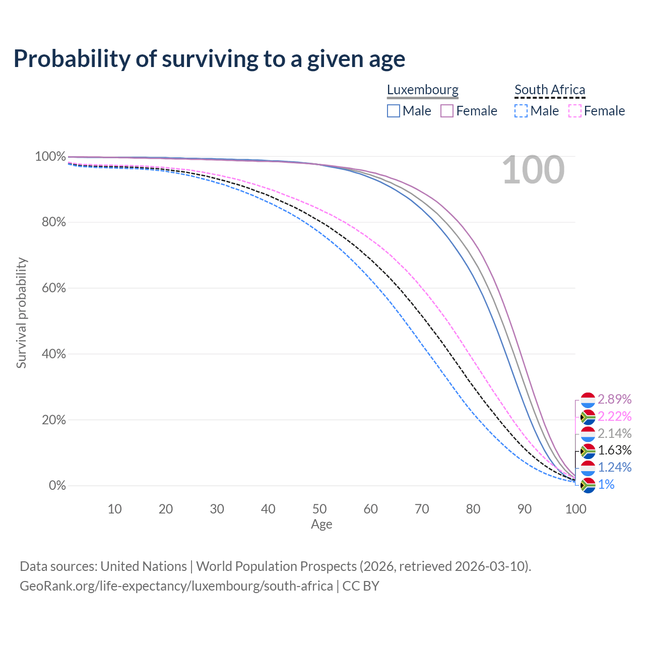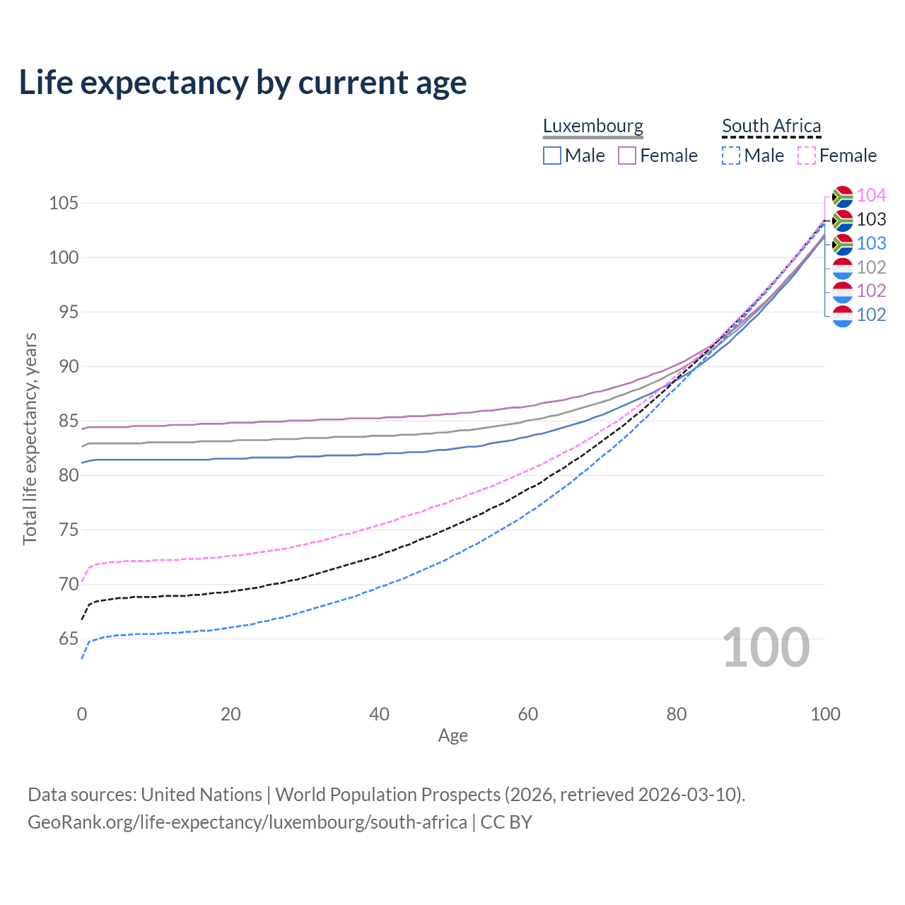 This life expectancy calculator shows the odds of living to 100, 95, 90, and below based on current age for both males and females in Luxembourg and South Africa, along with mean and median age of death. The calculations are based on the 2026 life tables (actuarial tables) from the UN World Population Prospects.