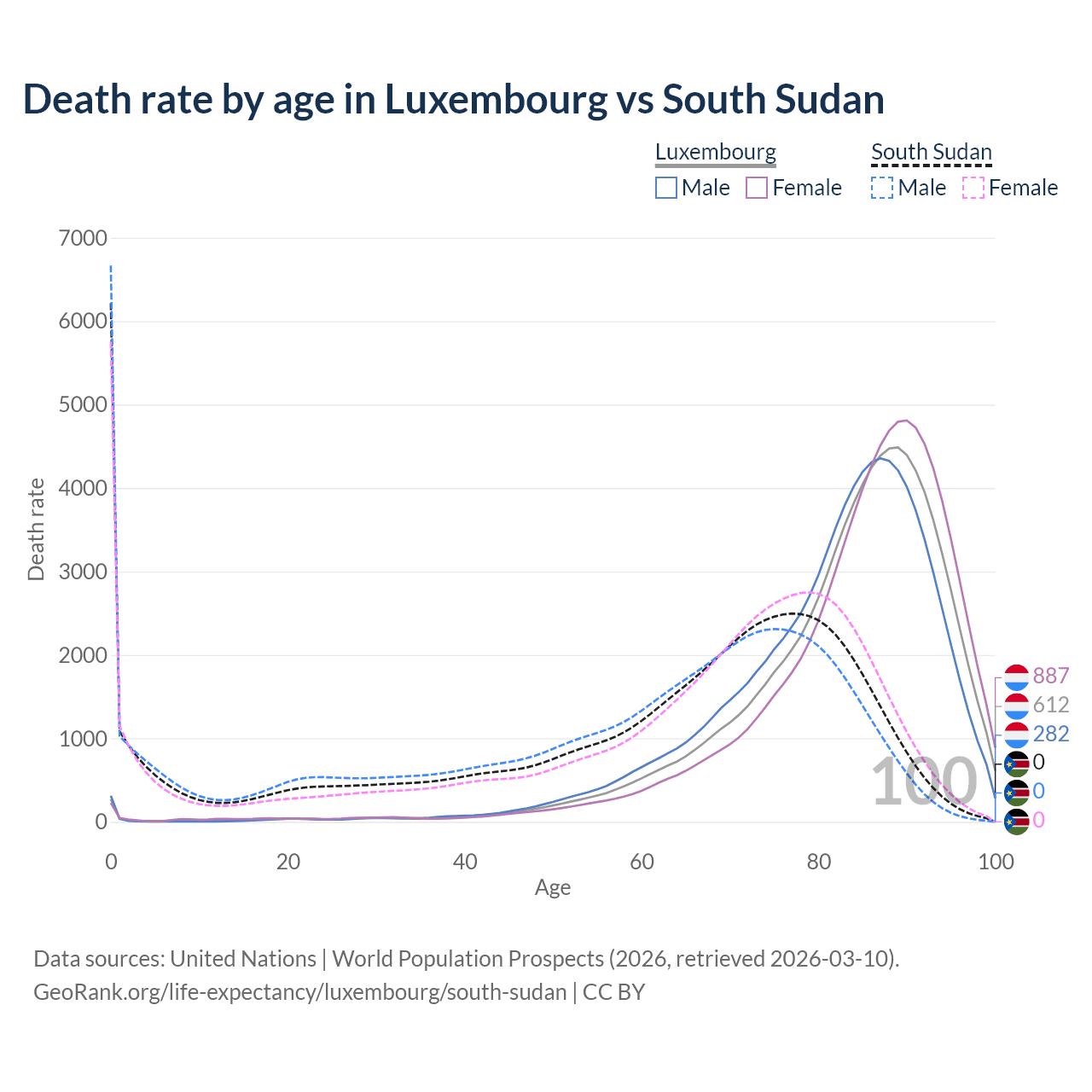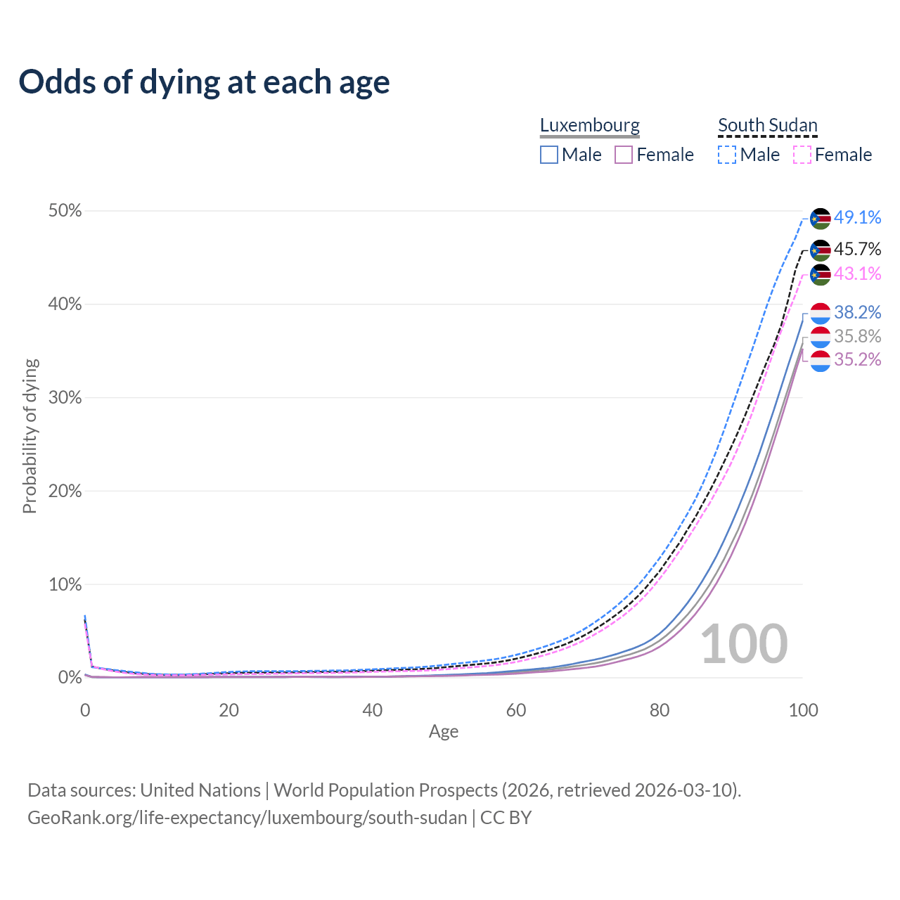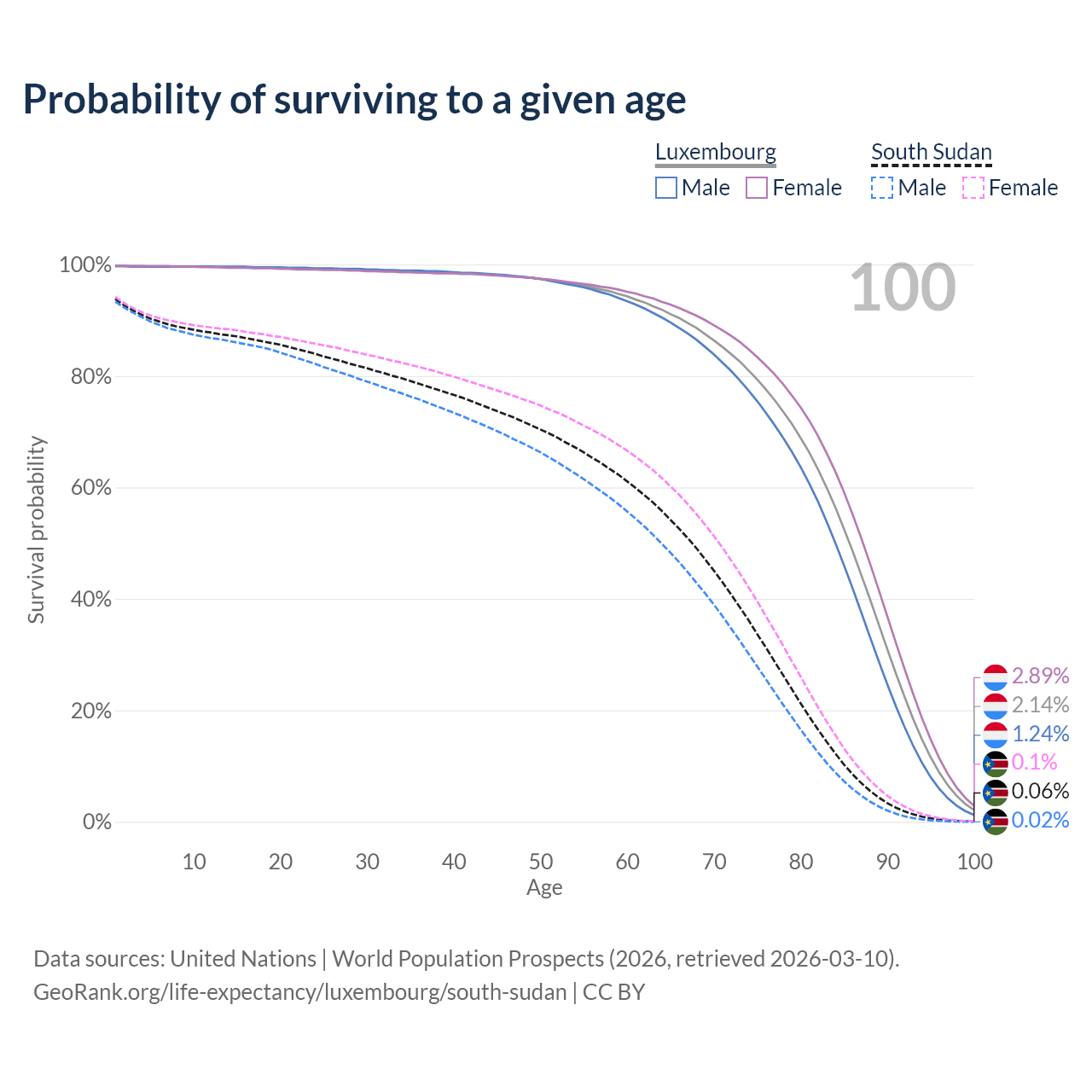 This life expectancy calculator shows the odds of living to 100, 95, 90, and below based on current age for both males and females in Luxembourg and South Sudan, along with mean and median age of death. The calculations are based on the 2026 life tables (actuarial tables) from the UN World Population Prospects.