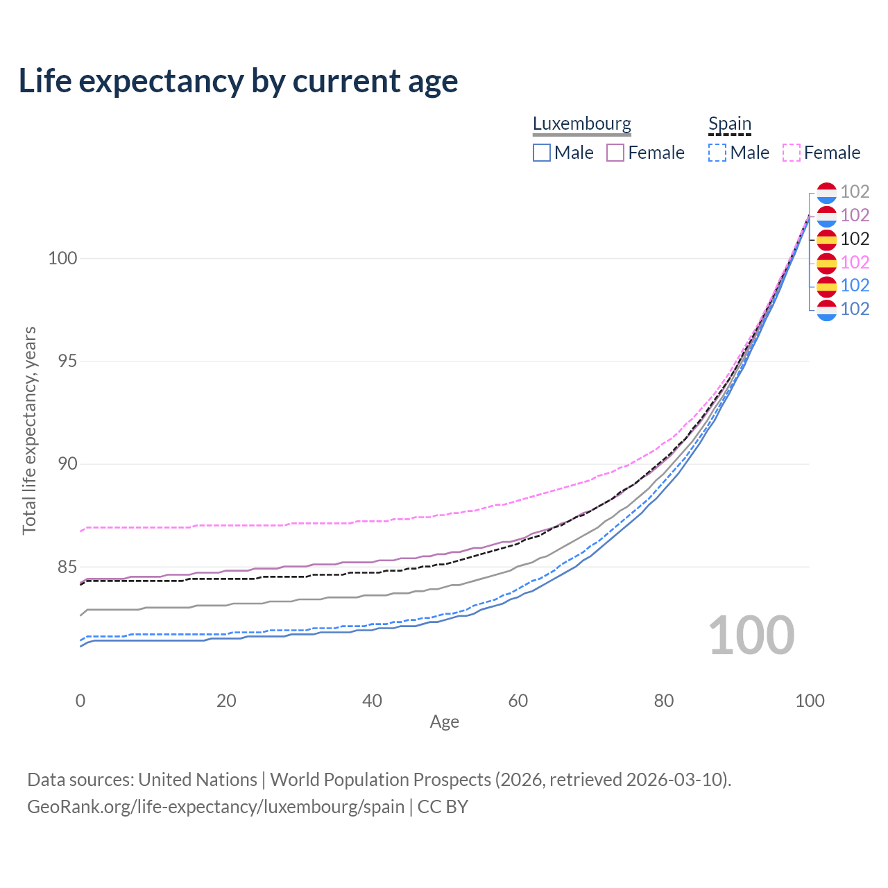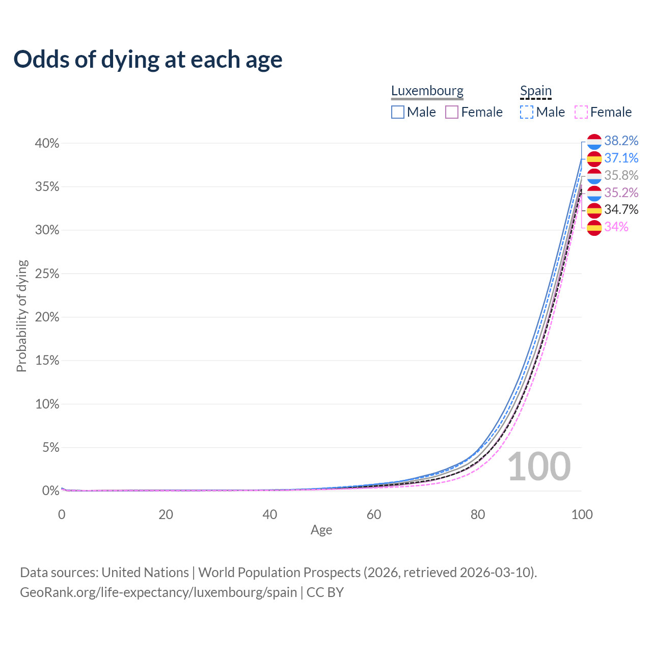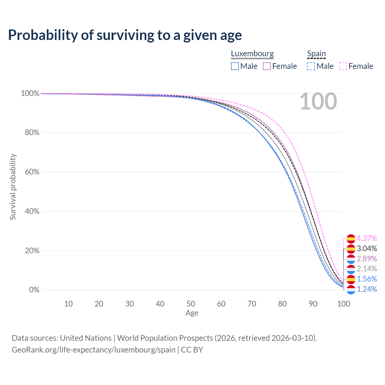 This life expectancy calculator shows the odds of living to 100, 95, 90, and below based on current age for both males and females in Luxembourg and Spain, along with mean and median age of death. The calculations are based on the 2026 life tables (actuarial tables) from the UN World Population Prospects.