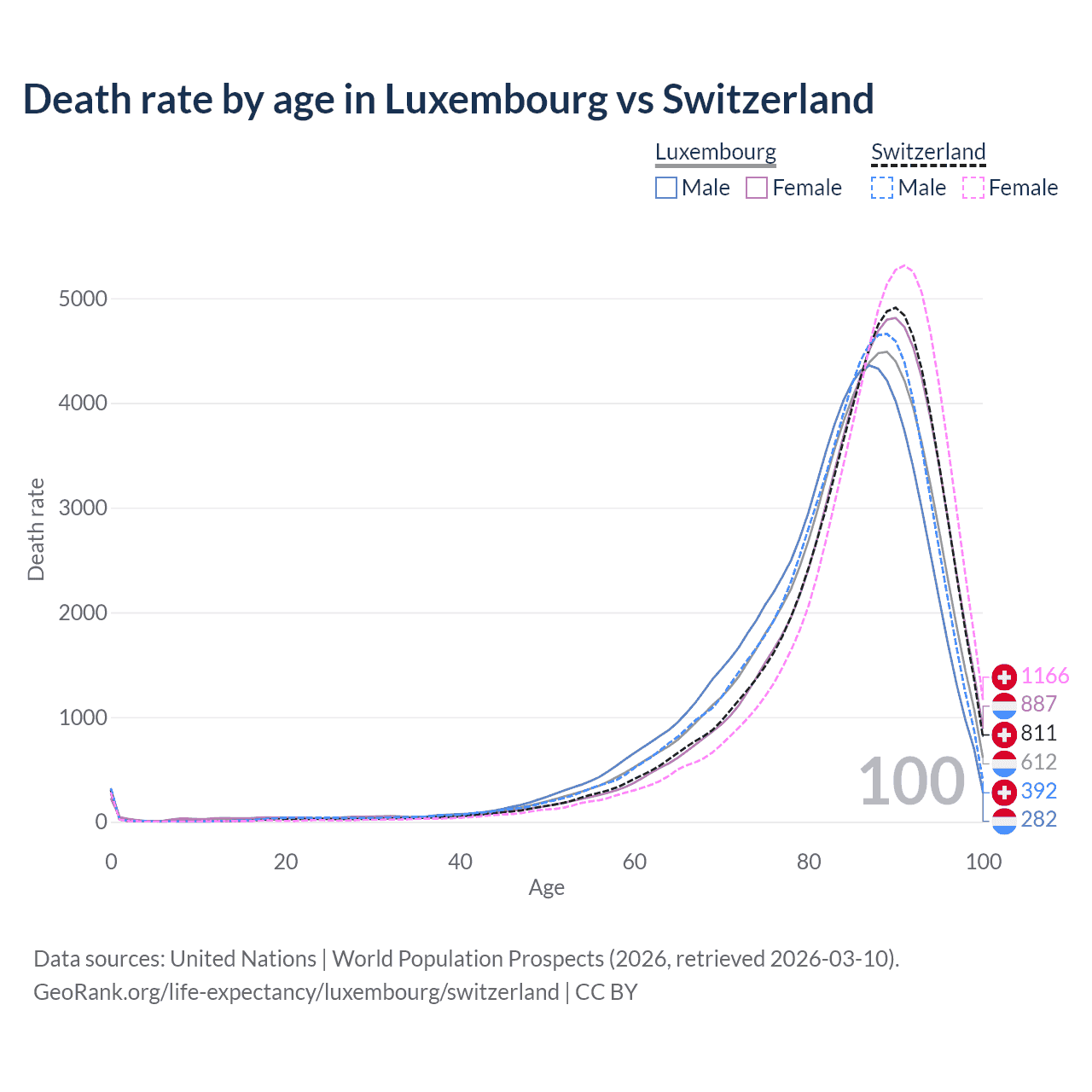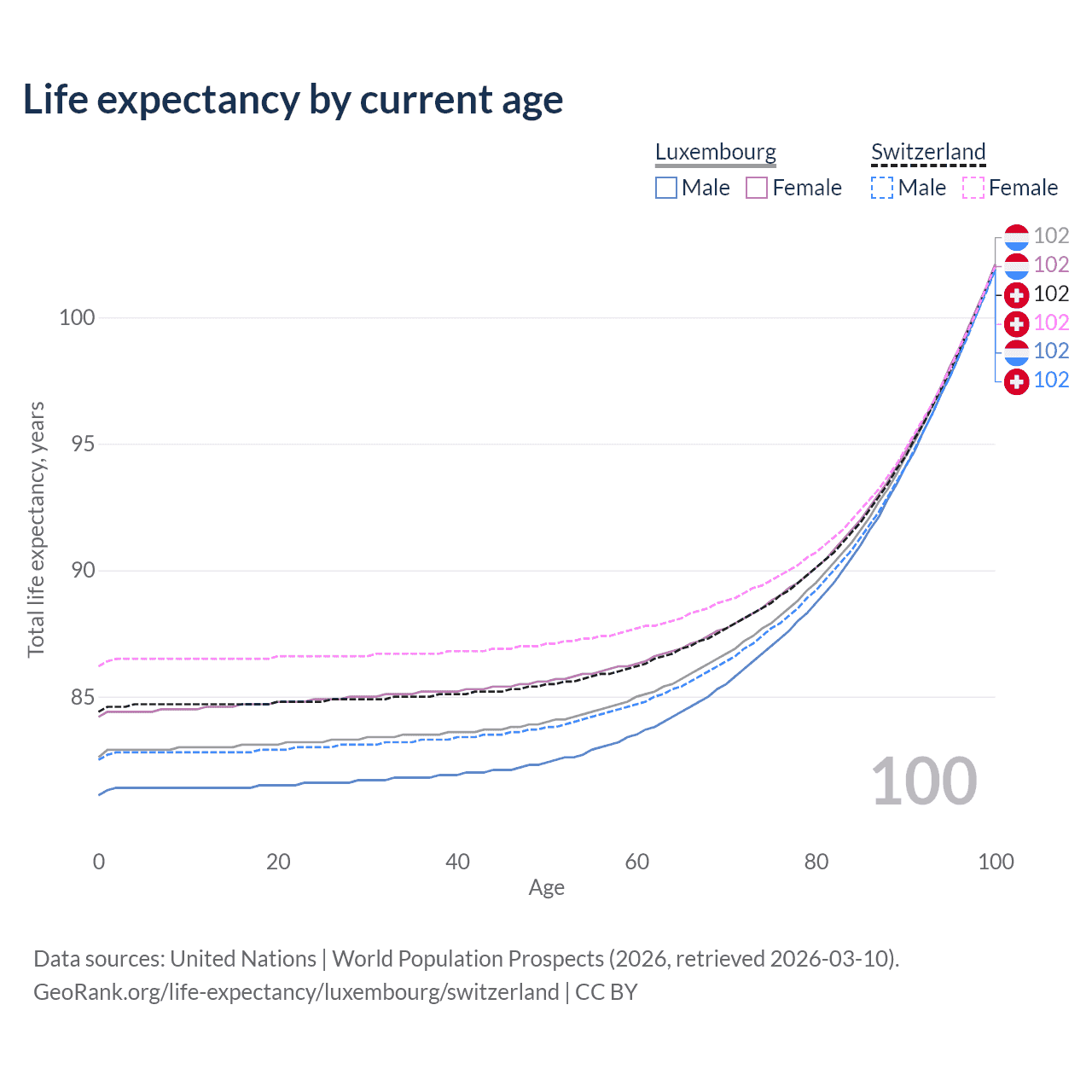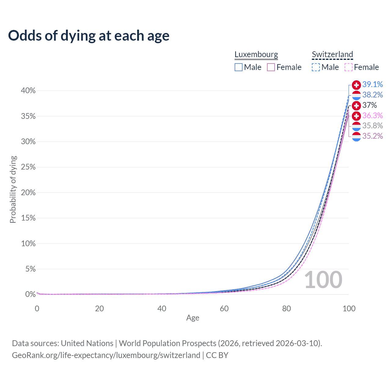 This life expectancy calculator shows the odds of living to 100, 95, 90, and below based on current age for both males and females in Luxembourg and Switzerland, along with mean and median age of death. The calculations are based on the 2026 life tables (actuarial tables) from the UN World Population Prospects.