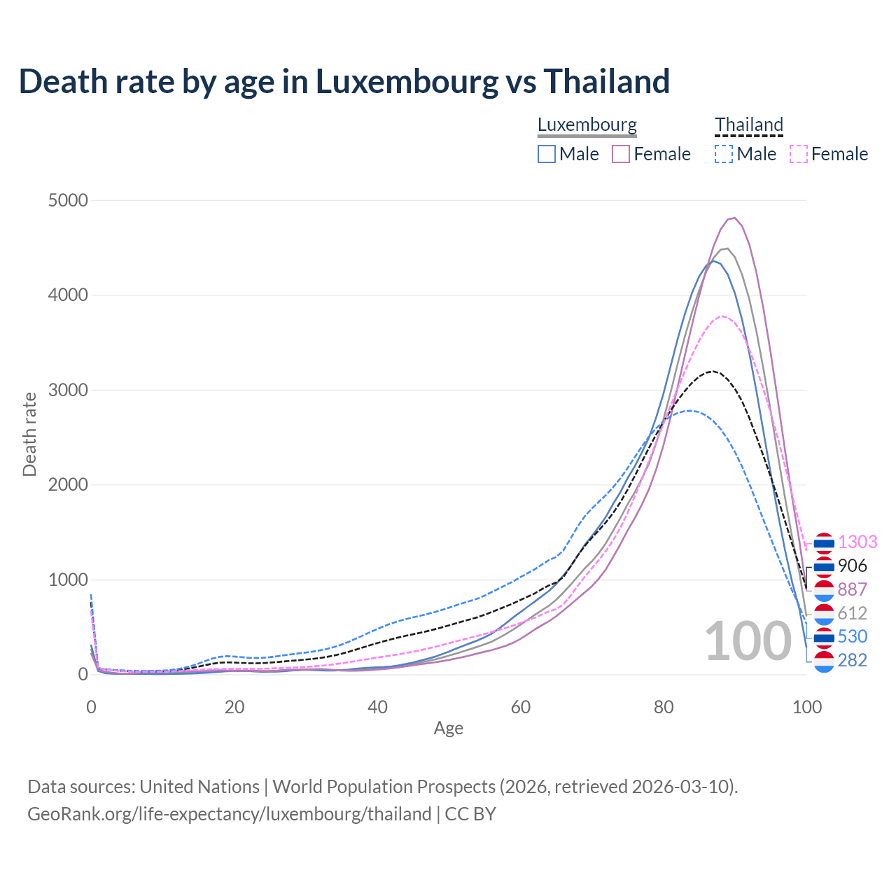 In Luxembourg, the most common age of death is 89, compared to 87 in Thailand. The median age of death is 85.7 in Luxembourg and 81.8 in Thailand, meaning only half of each cohort is expected to live past that age.