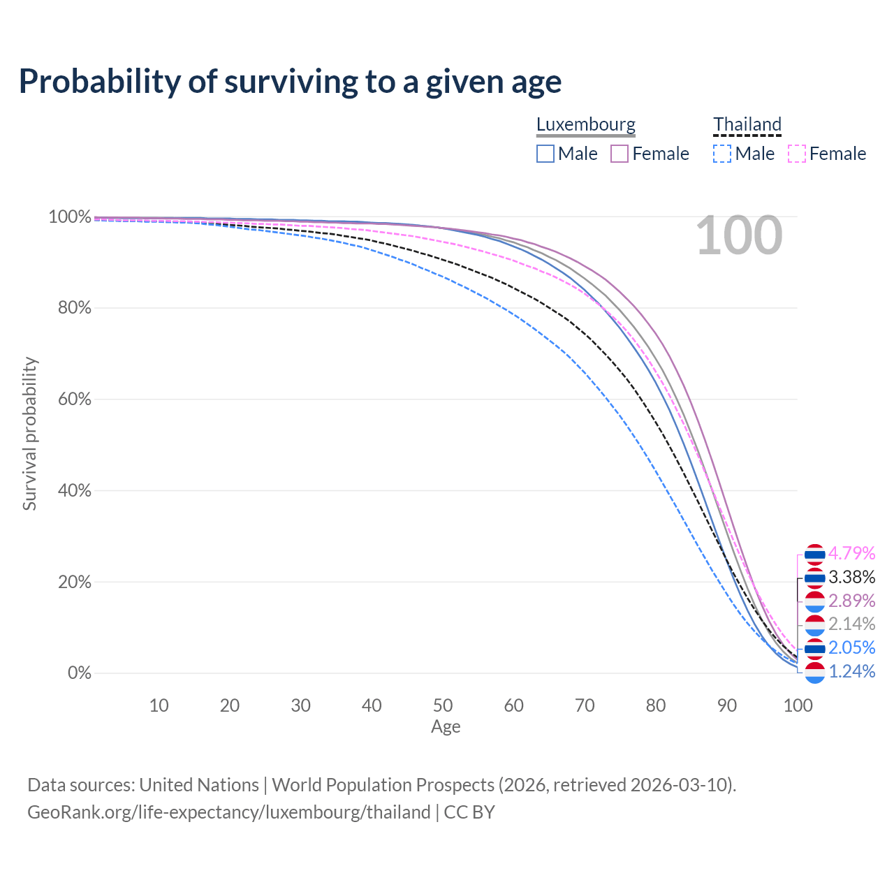This life expectancy calculator shows the odds of living to 100, 95, 90, and below based on current age for both males and females in Luxembourg and Thailand, along with mean and median age of death. The calculations are based on the 2026 life tables (actuarial tables) from the UN World Population Prospects.