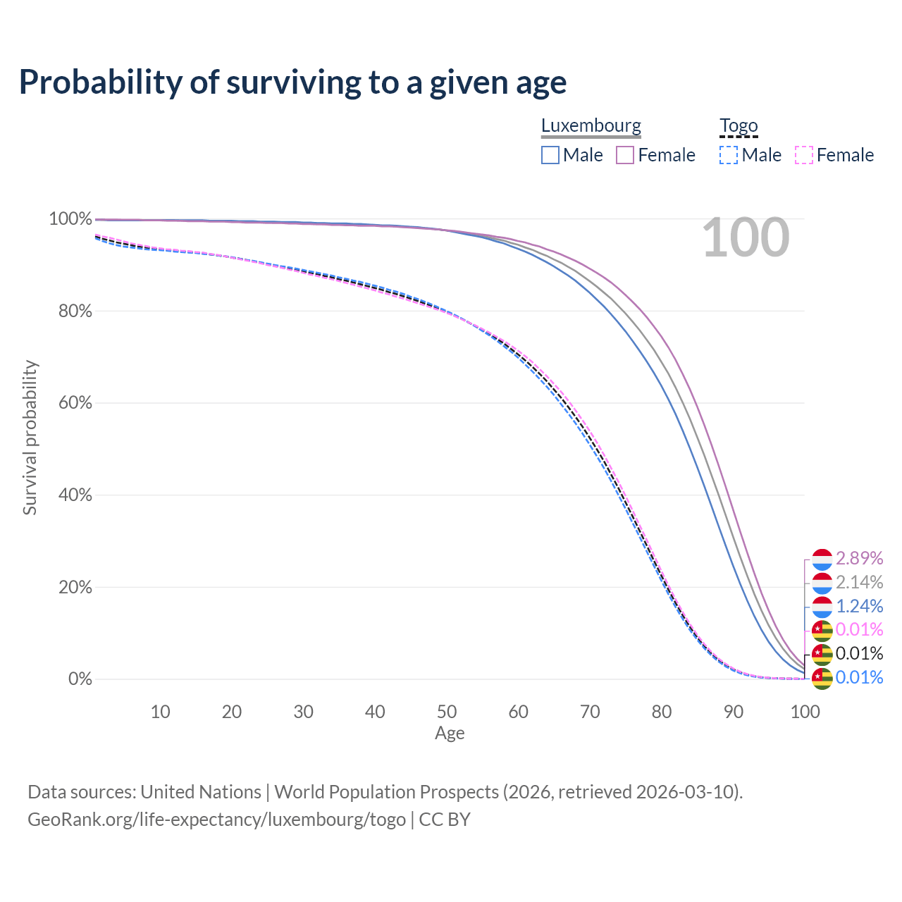This life expectancy calculator shows the odds of living to 100, 95, 90, and below based on current age for both males and females in Luxembourg and Togo, along with mean and median age of death. The calculations are based on the 2026 life tables (actuarial tables) from the UN World Population Prospects.