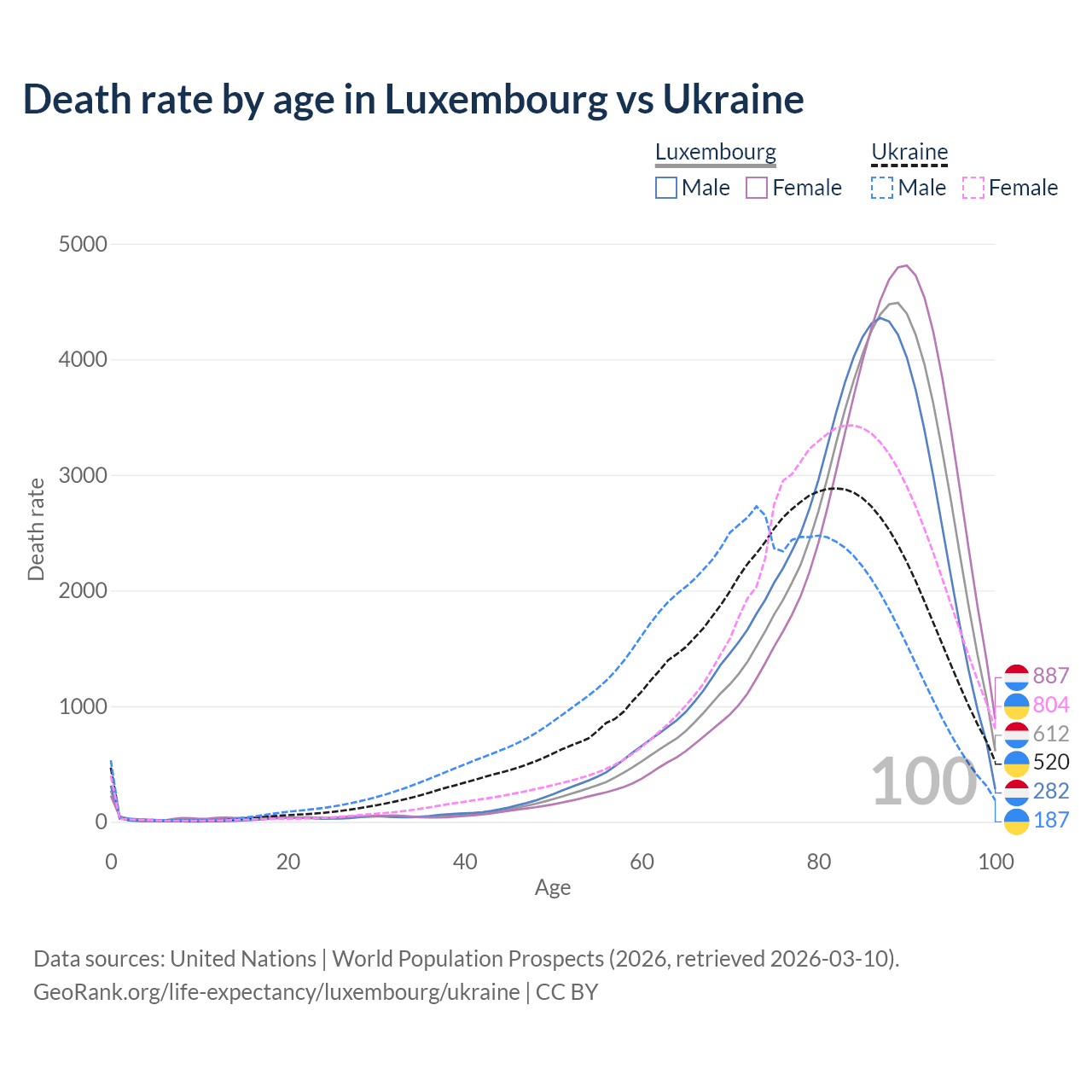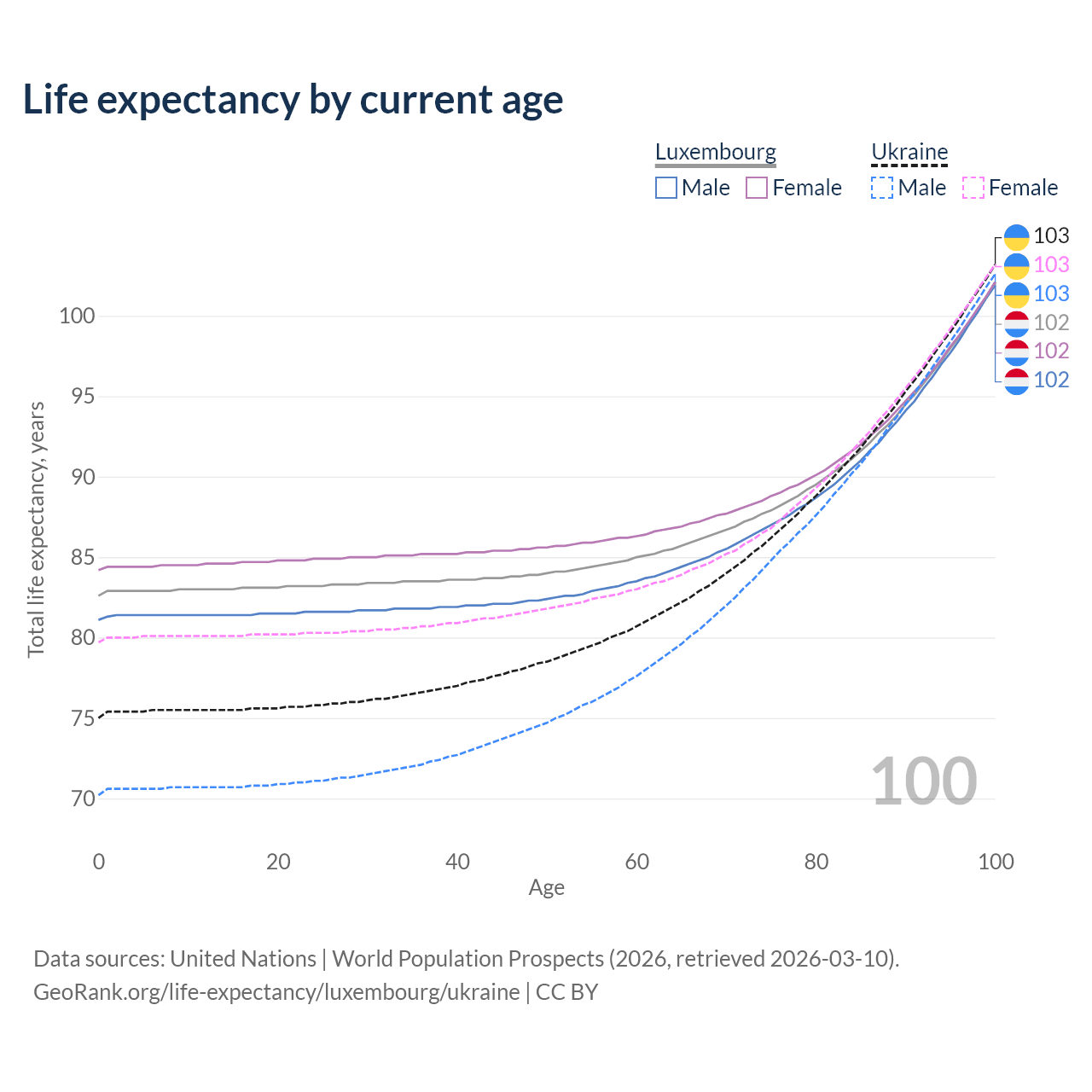 This life expectancy calculator shows the odds of living to 100, 95, 90, and below based on current age for both males and females in Luxembourg and Ukraine, along with mean and median age of death. The calculations are based on the 2026 life tables (actuarial tables) from the UN World Population Prospects.