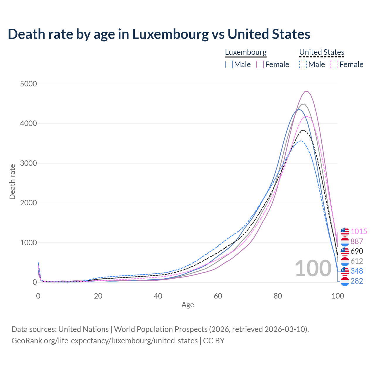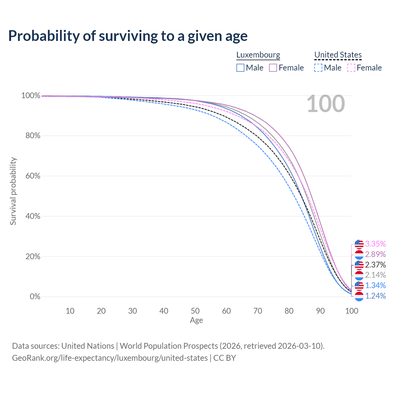 This life expectancy calculator shows the odds of living to 100, 95, 90, and below based on current age for both males and females in Luxembourg and the United States, along with mean and median age of death. The calculations are based on the 2026 life tables (actuarial tables) from the UN World Population Prospects.
