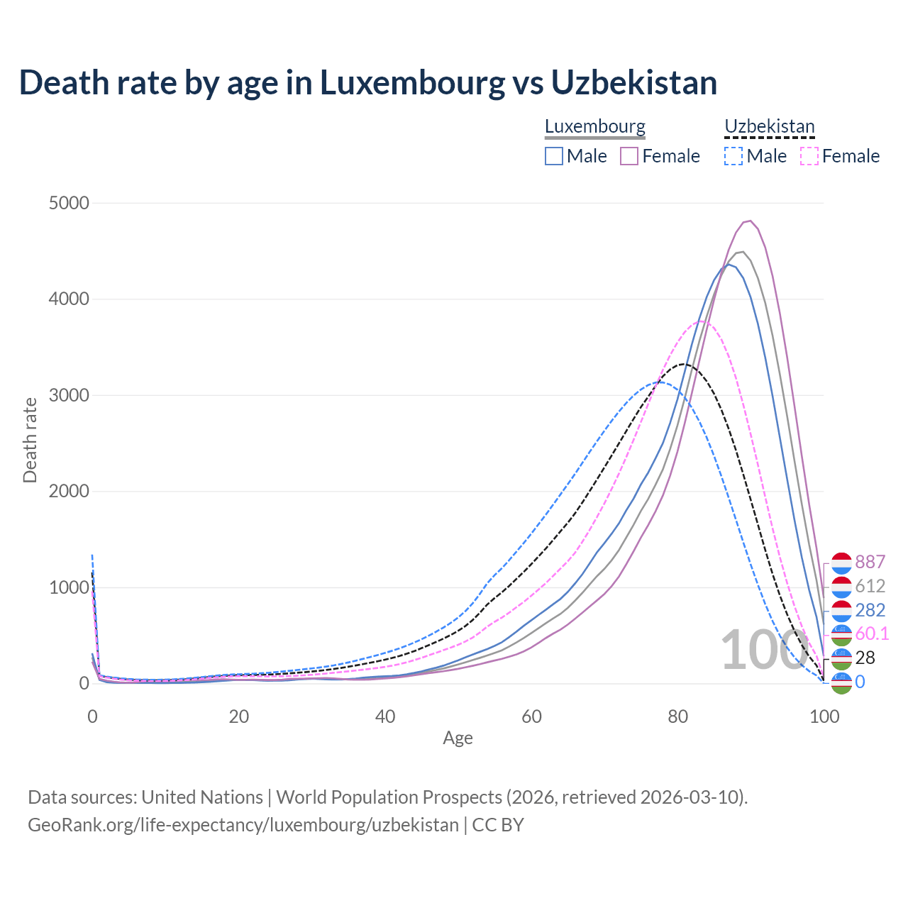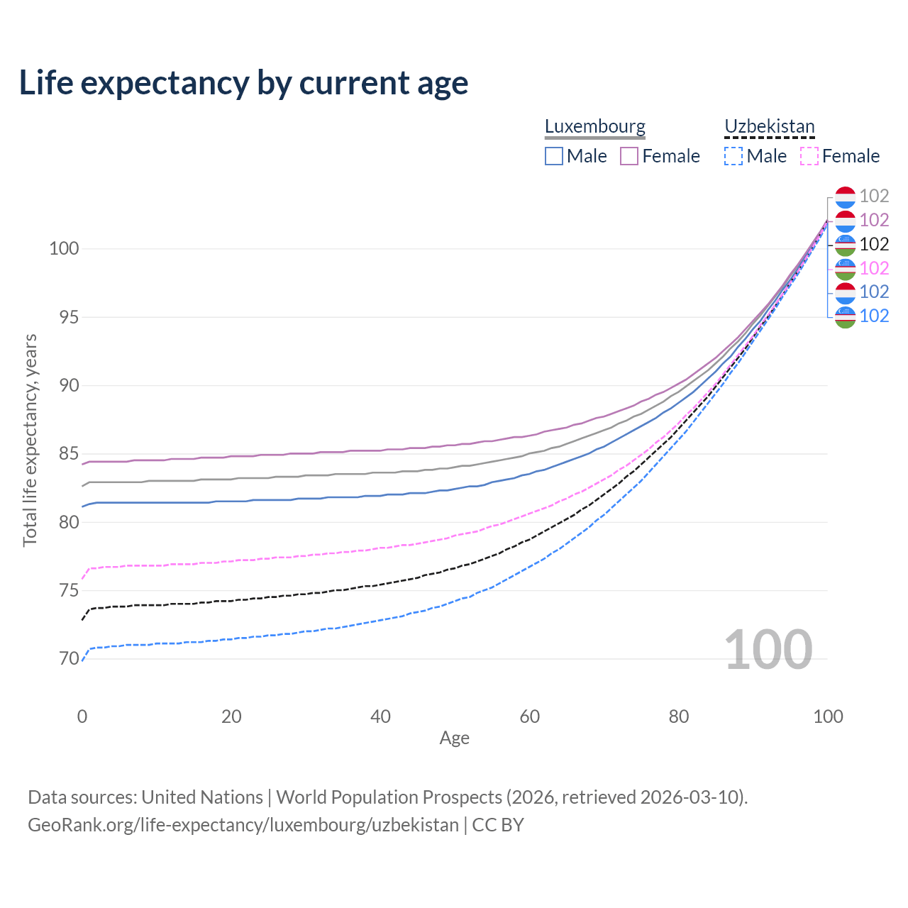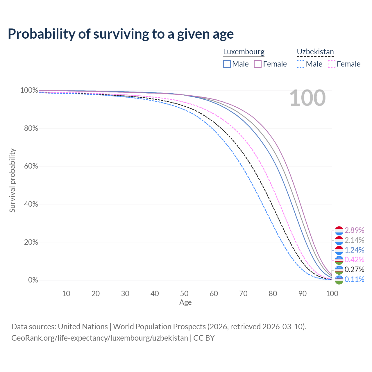 This life expectancy calculator shows the odds of living to 100, 95, 90, and below based on current age for both males and females in Luxembourg and Uzbekistan, along with mean and median age of death. The calculations are based on the 2026 life tables (actuarial tables) from the UN World Population Prospects.