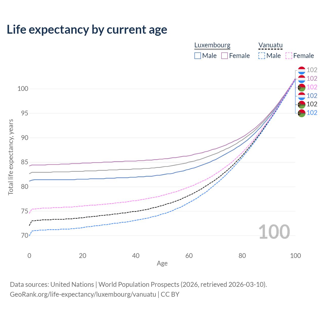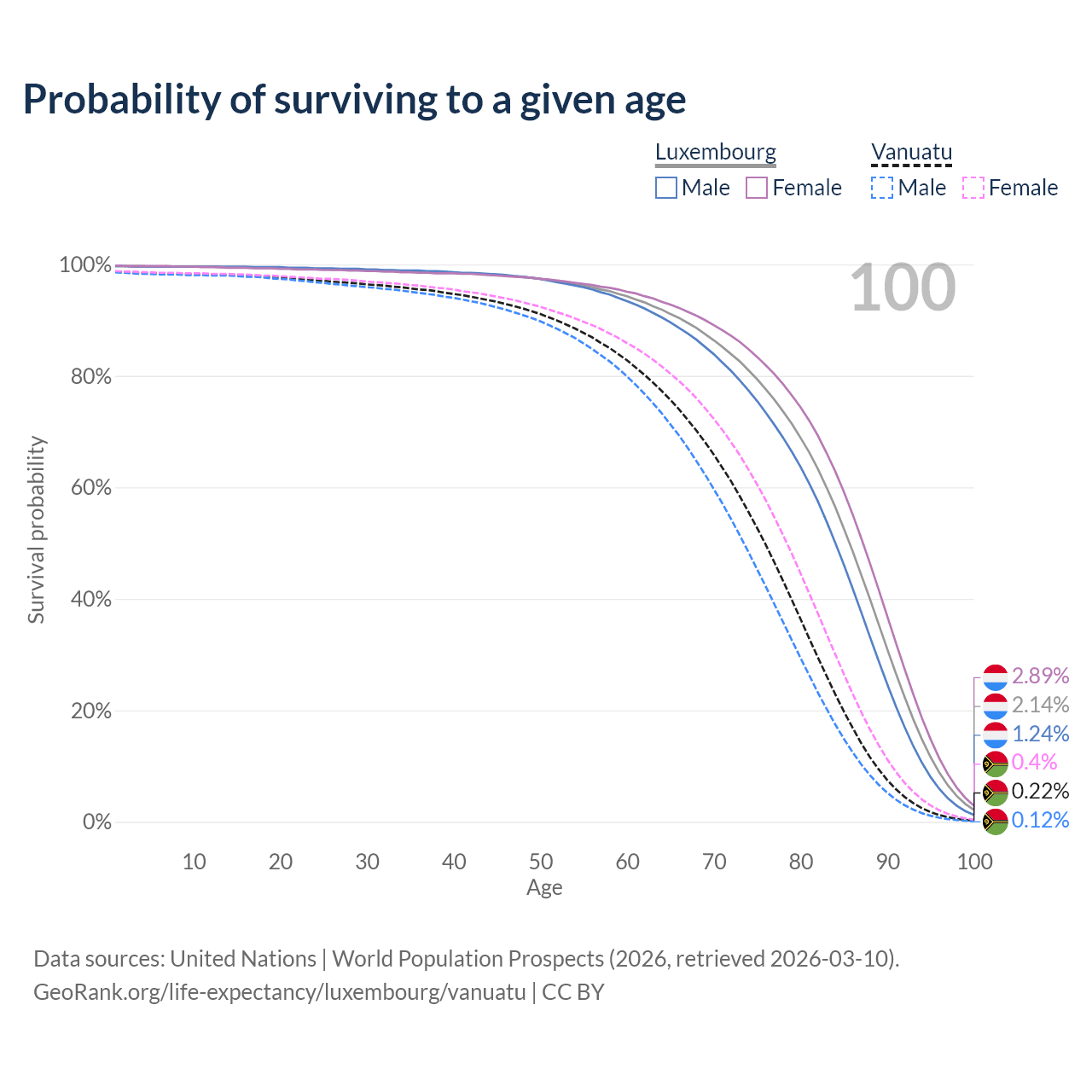 This life expectancy calculator shows the odds of living to 100, 95, 90, and below based on current age for both males and females in Luxembourg and Vanuatu, along with mean and median age of death. The calculations are based on the 2026 life tables (actuarial tables) from the UN World Population Prospects.