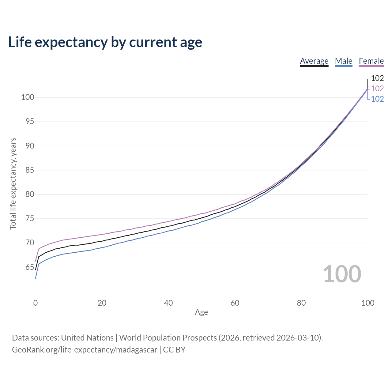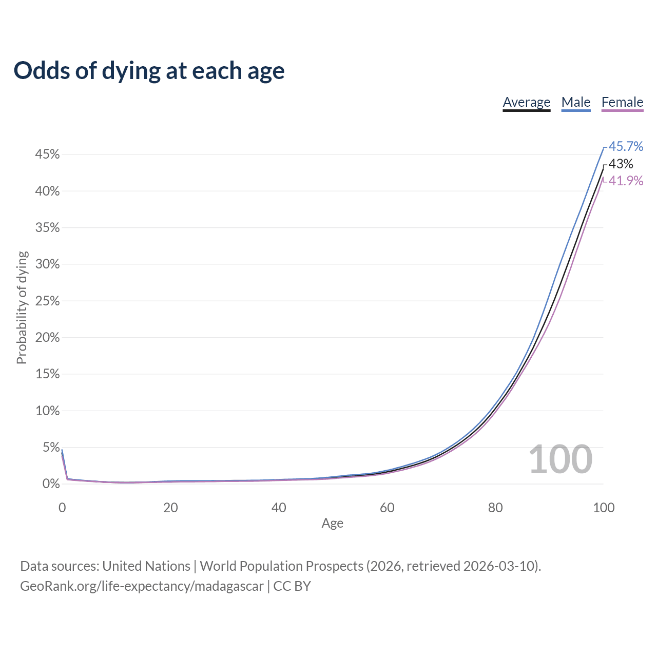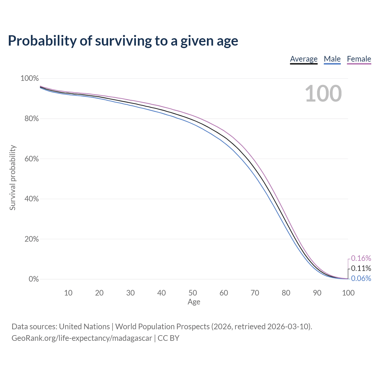 This life expectancy calculator shows the odds of living to 100, 95, 90, and below based on current age for both males and females in Madagascar, along with mean and median age of death. The calculations are based on the 2026 life tables (actuarial tables) from the UN World Population Prospects.