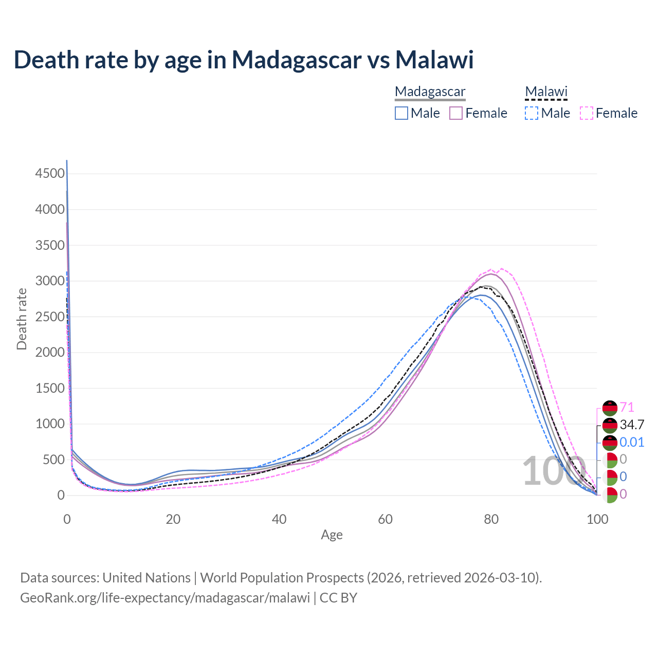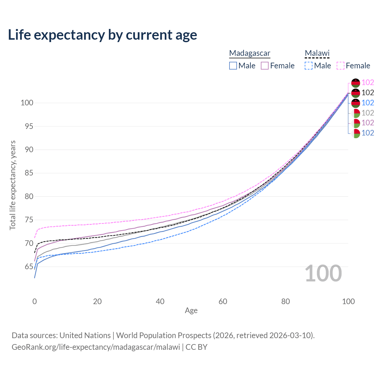 This life expectancy calculator shows the odds of living to 100, 95, 90, and below based on current age for both males and females in Madagascar and Malawi, along with mean and median age of death. The calculations are based on the 2026 life tables (actuarial tables) from the UN World Population Prospects.
