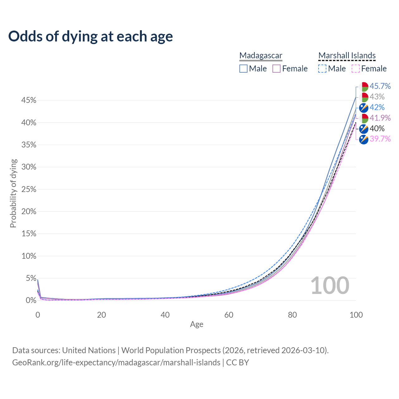 This life expectancy calculator shows the odds of living to 100, 95, 90, and below based on current age for both males and females in Madagascar and the Marshall Islands, along with mean and median age of death. The calculations are based on the 2026 life tables (actuarial tables) from the UN World Population Prospects.