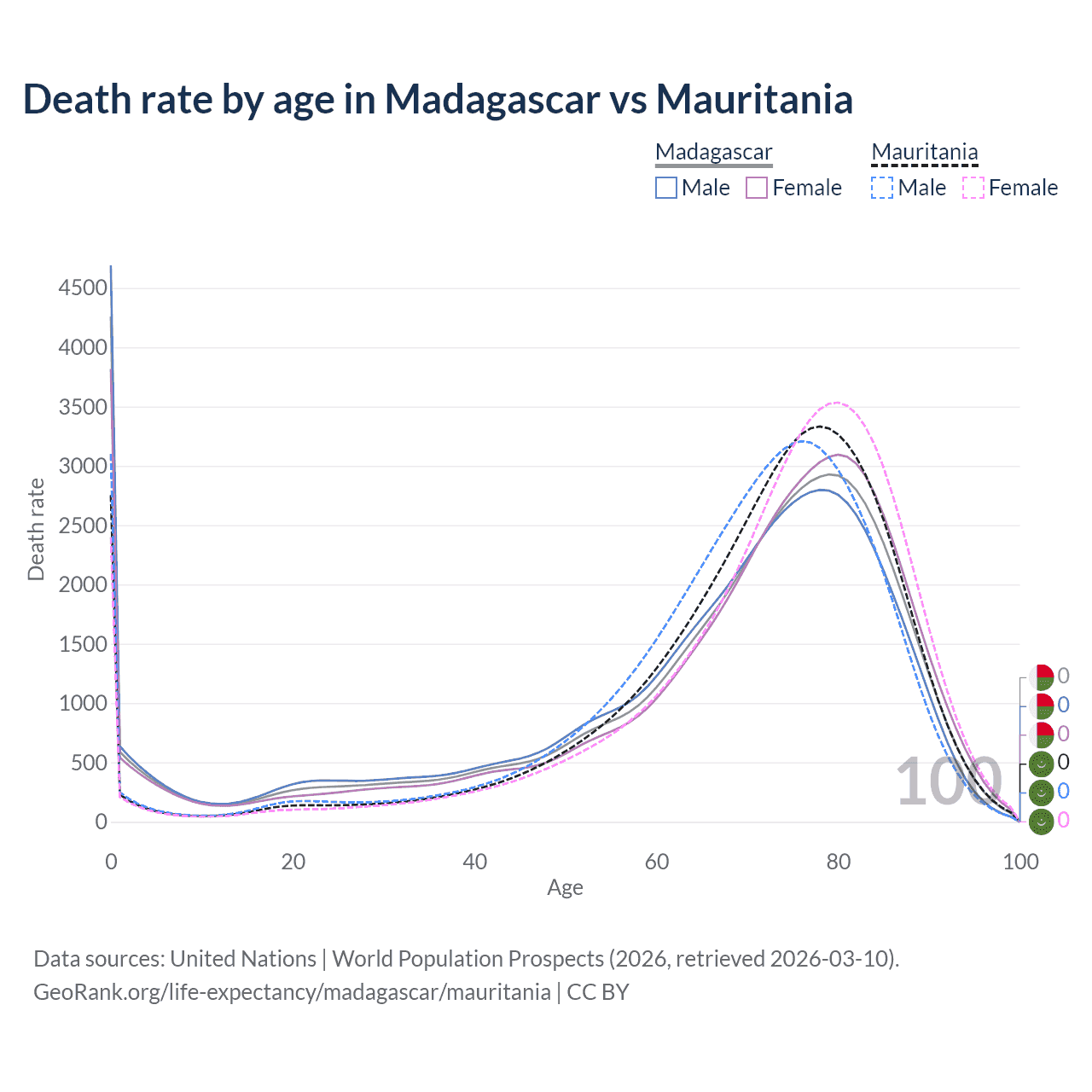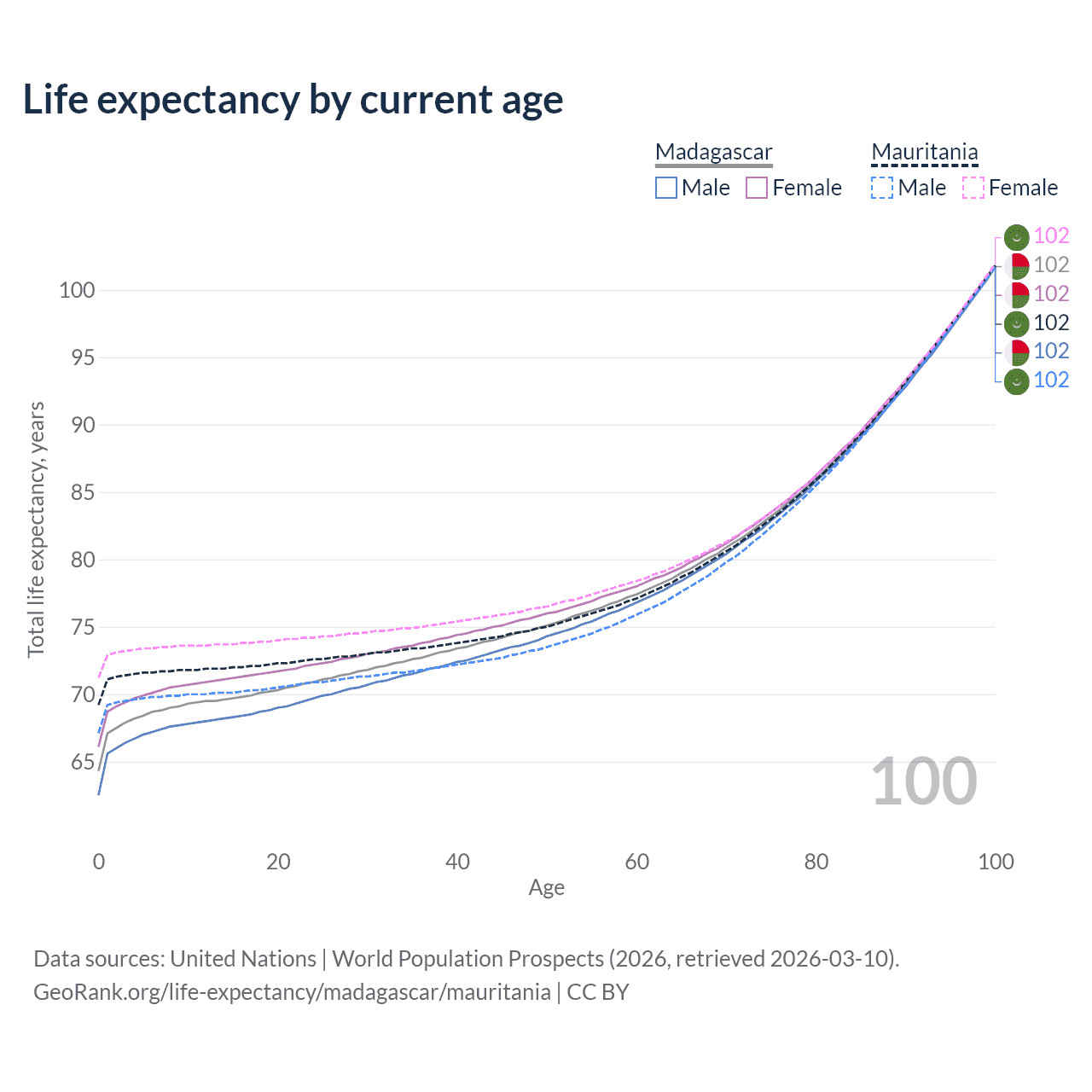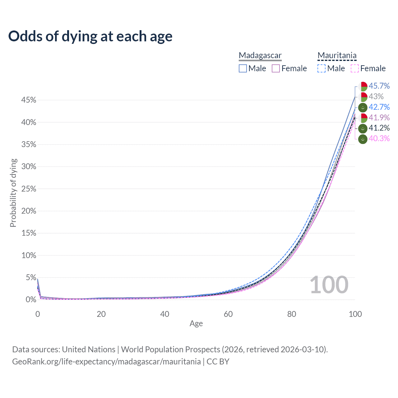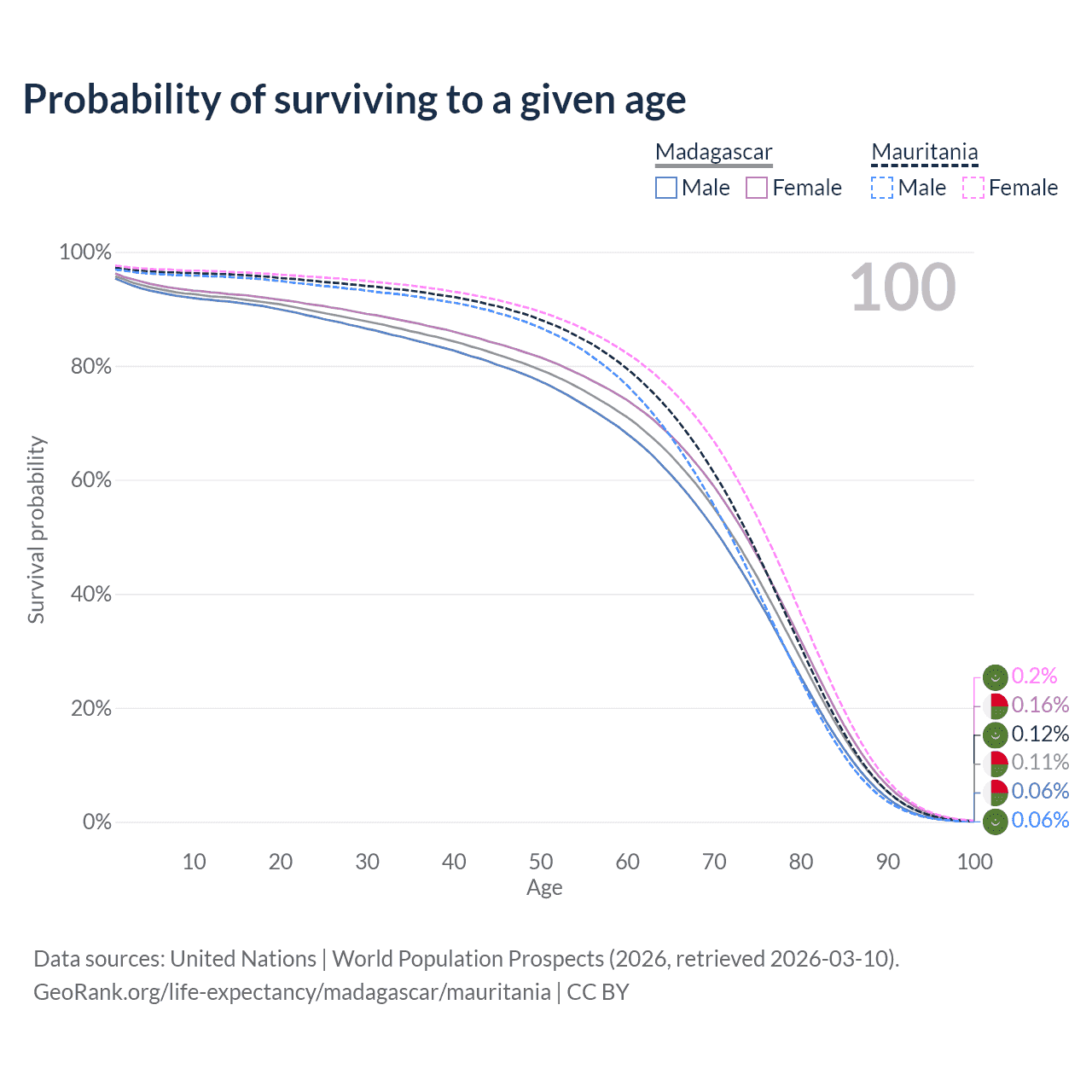This life expectancy calculator shows the odds of living to 100, 95, 90, and below based on current age for both males and females in Madagascar and Mauritania, along with mean and median age of death. The calculations are based on the 2026 life tables (actuarial tables) from the UN World Population Prospects.