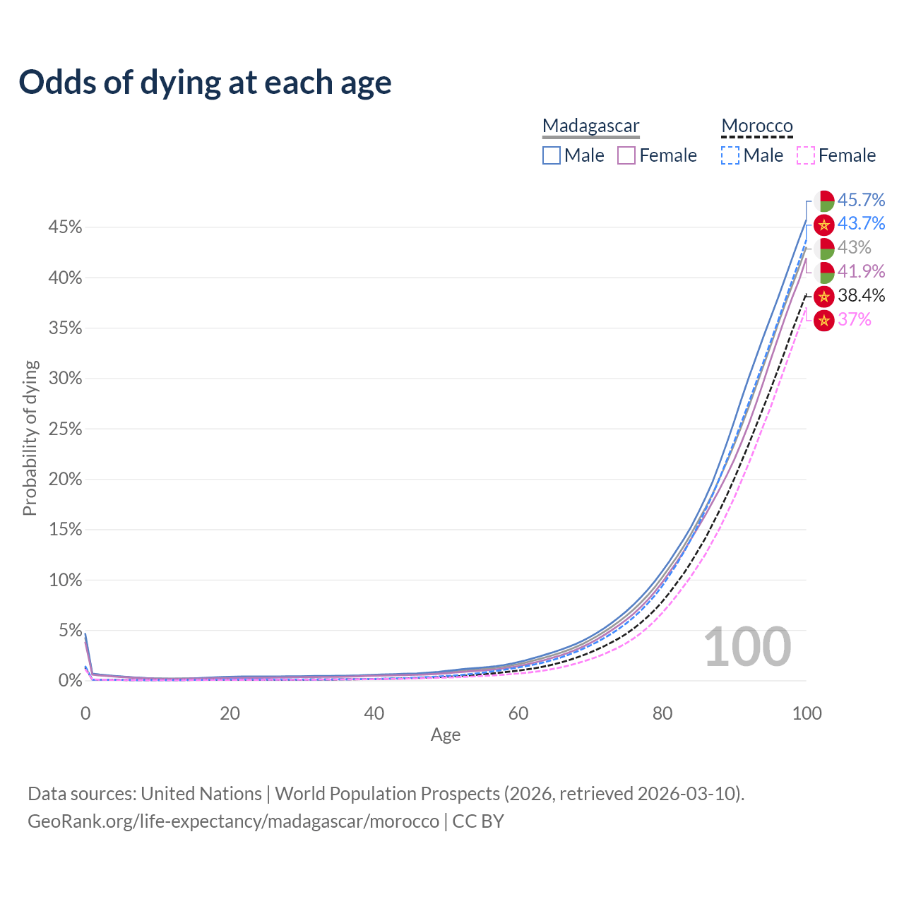 This life expectancy calculator shows the odds of living to 100, 95, 90, and below based on current age for both males and females in Madagascar and Morocco, along with mean and median age of death. The calculations are based on the 2026 life tables (actuarial tables) from the UN World Population Prospects.