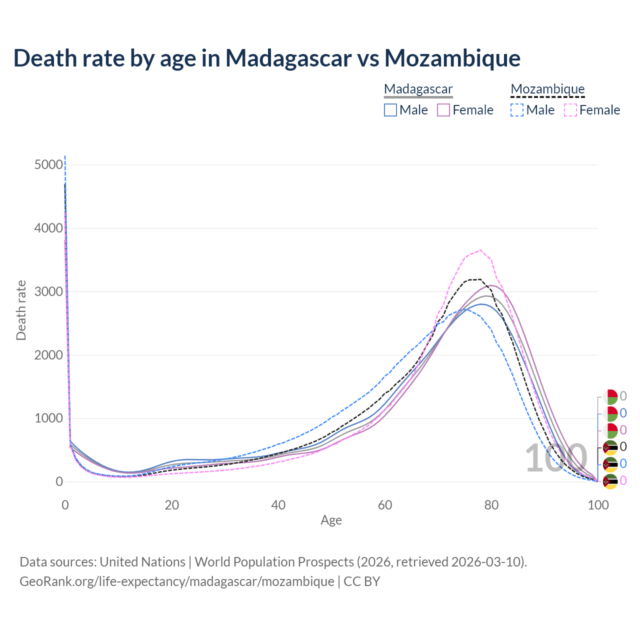 In Madagascar, the most common age of death is 0, compared to 0 in Mozambique. The median age of death is 72.2 in Madagascar and 71.2 in Mozambique, meaning only half of each cohort is expected to live past that age.