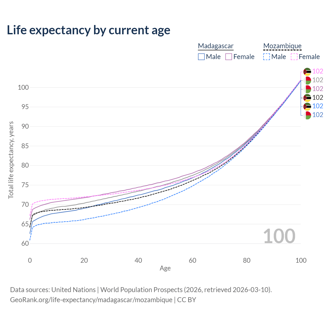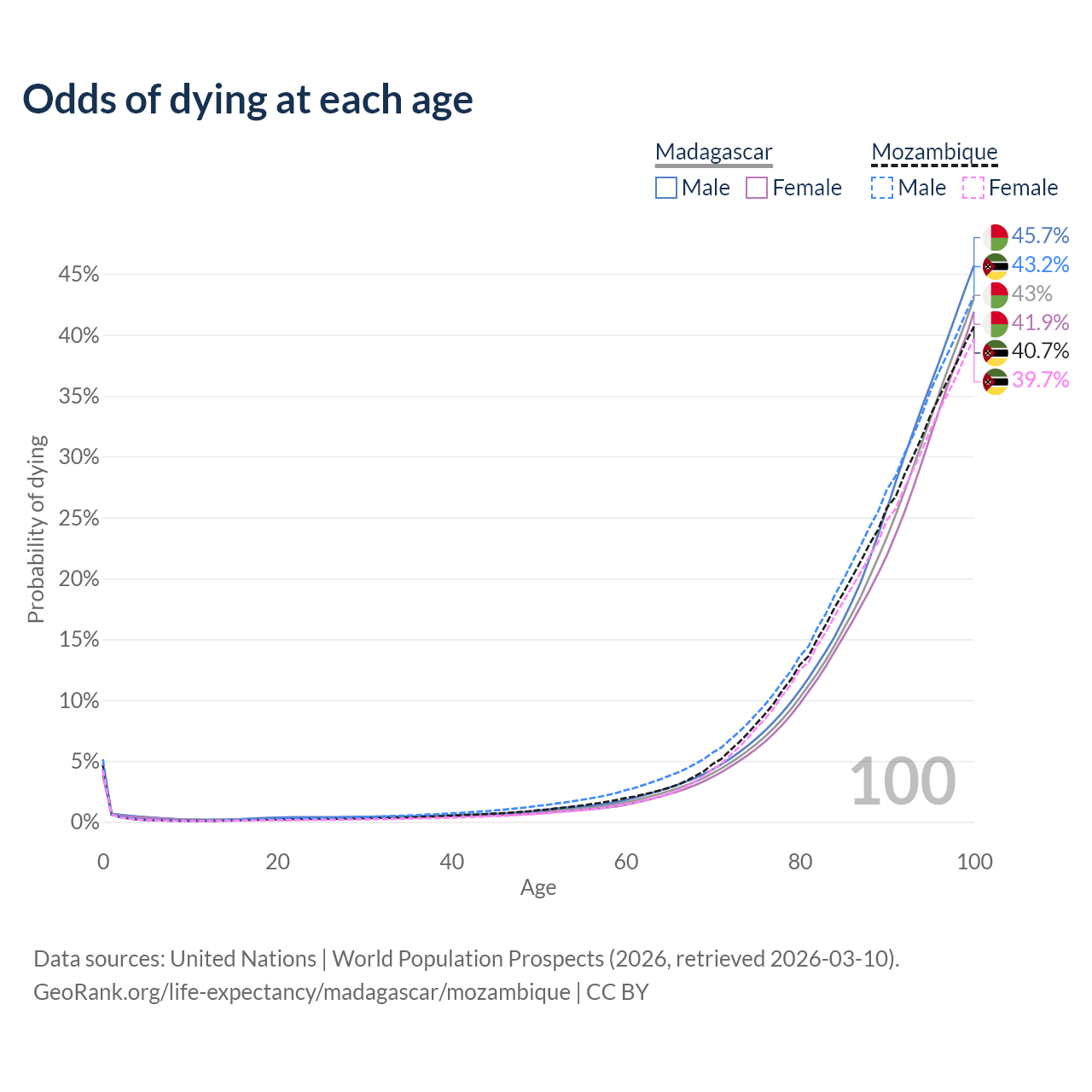 This life expectancy calculator shows the odds of living to 100, 95, 90, and below based on current age for both males and females in Madagascar and Mozambique, along with mean and median age of death. The calculations are based on the 2026 life tables (actuarial tables) from the UN World Population Prospects.