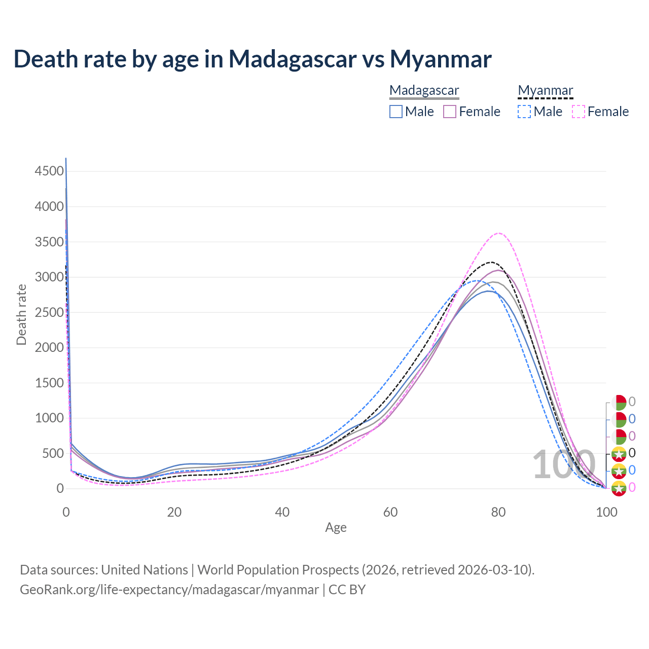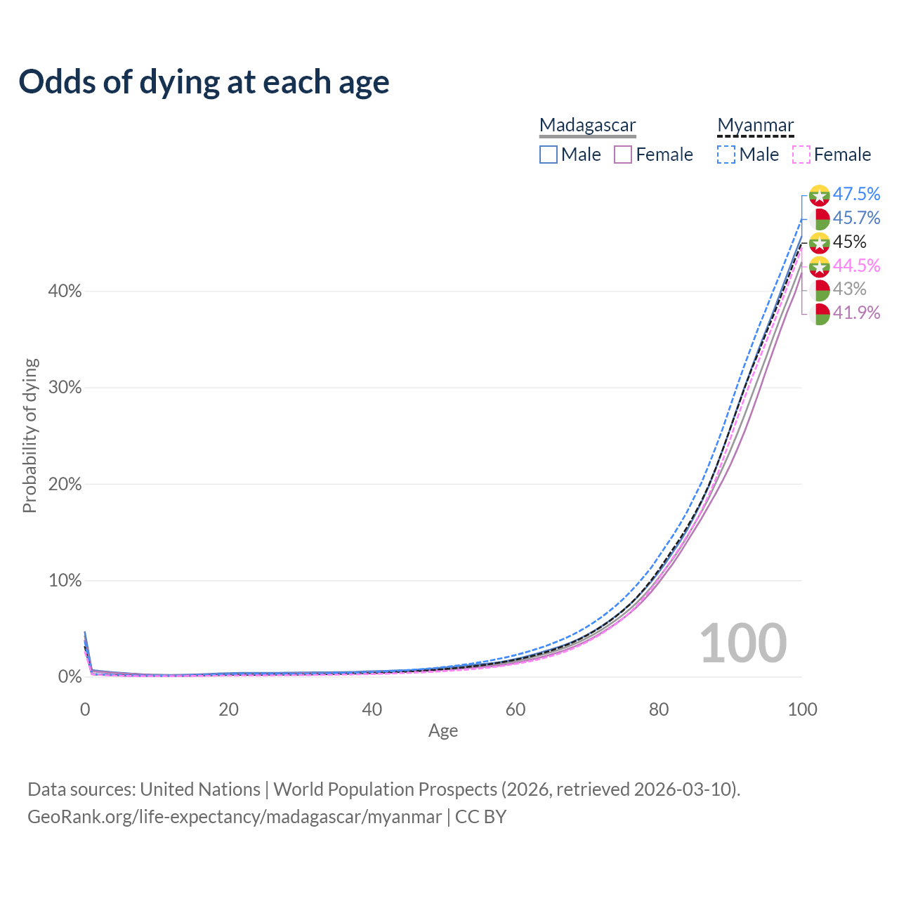 This life expectancy calculator shows the odds of living to 100, 95, 90, and below based on current age for both males and females in Madagascar and Myanmar, along with mean and median age of death. The calculations are based on the 2026 life tables (actuarial tables) from the UN World Population Prospects.