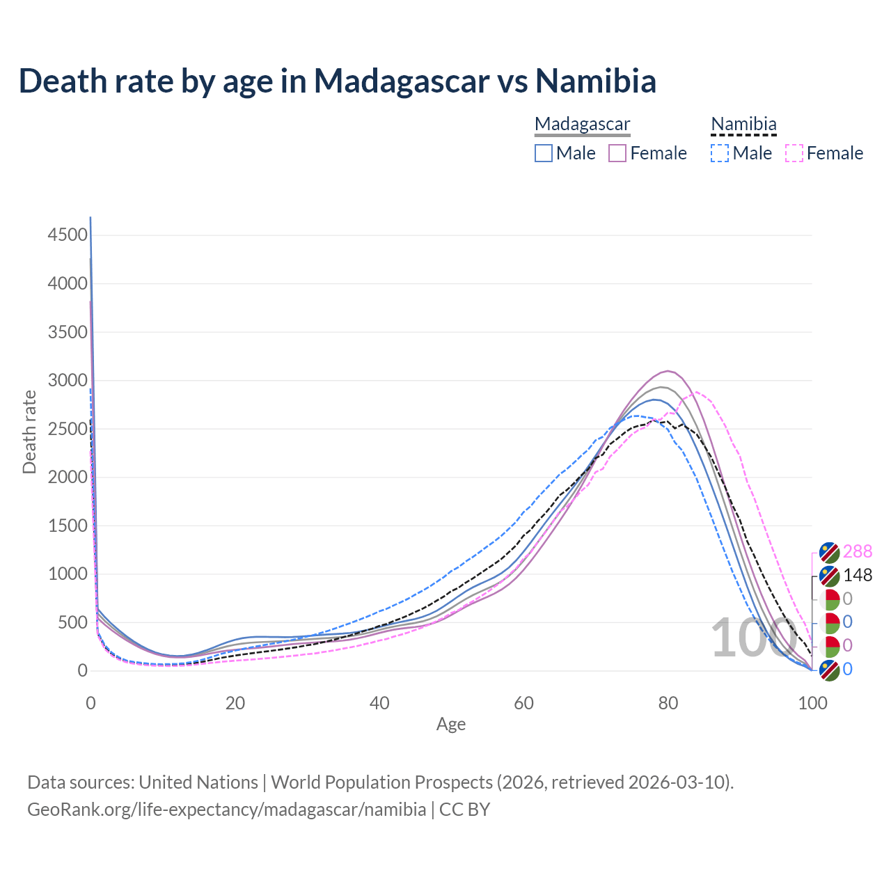 In Madagascar, the most common age of death is 0, compared to 0 in Namibia. The median age of death is 72.2 in Madagascar and 72.7 in Namibia, meaning only half of each cohort is expected to live past that age.