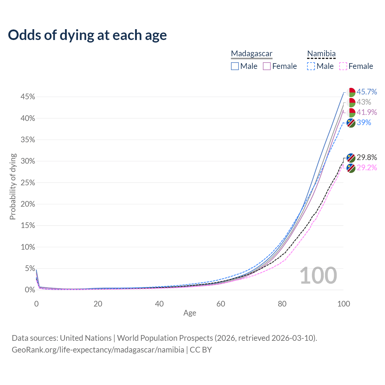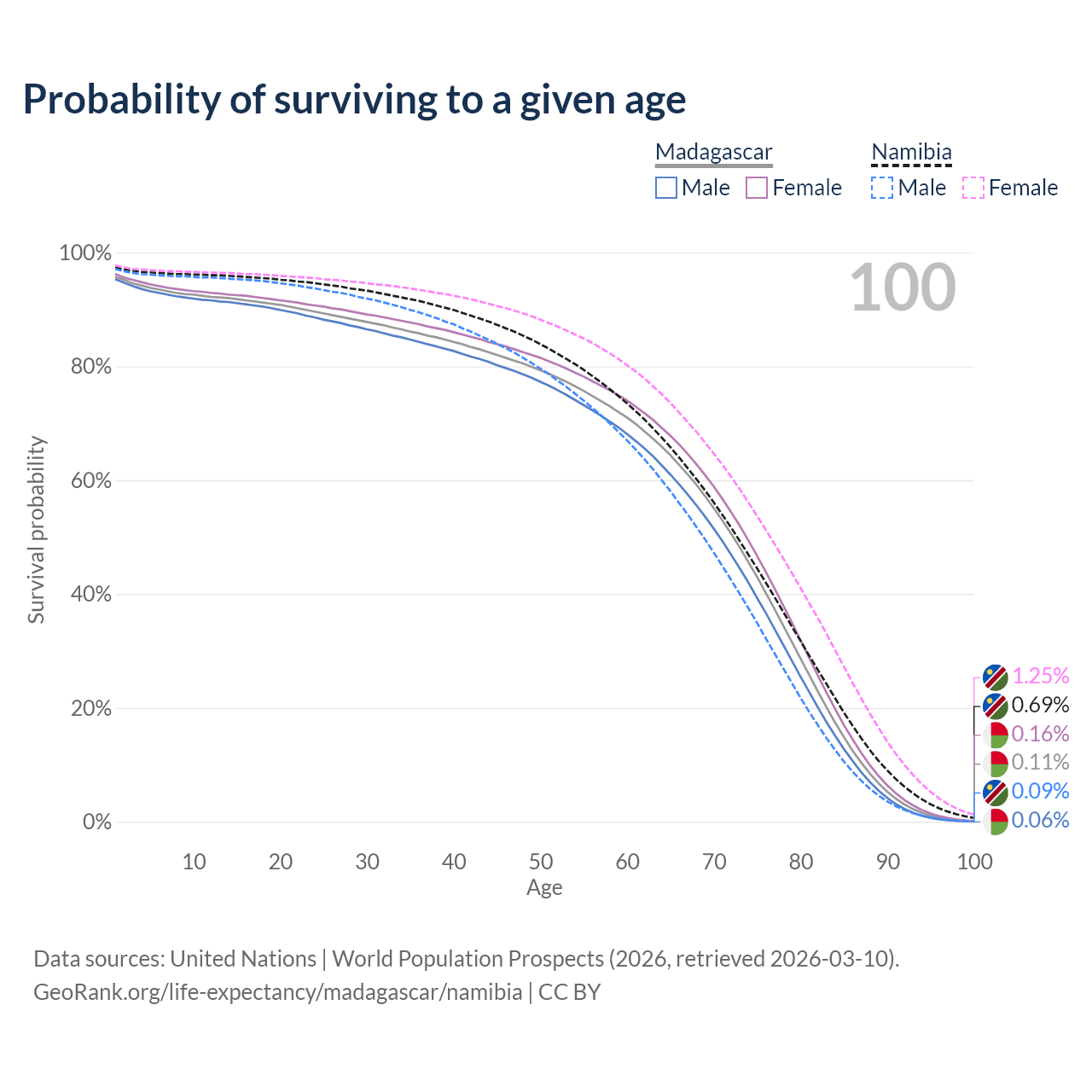 This life expectancy calculator shows the odds of living to 100, 95, 90, and below based on current age for both males and females in Madagascar and Namibia, along with mean and median age of death. The calculations are based on the 2026 life tables (actuarial tables) from the UN World Population Prospects.