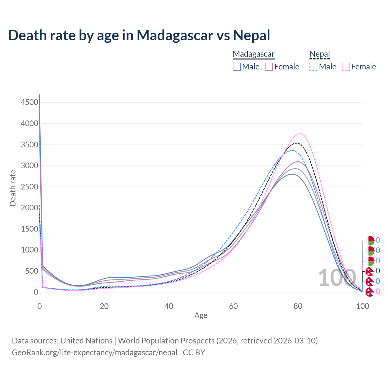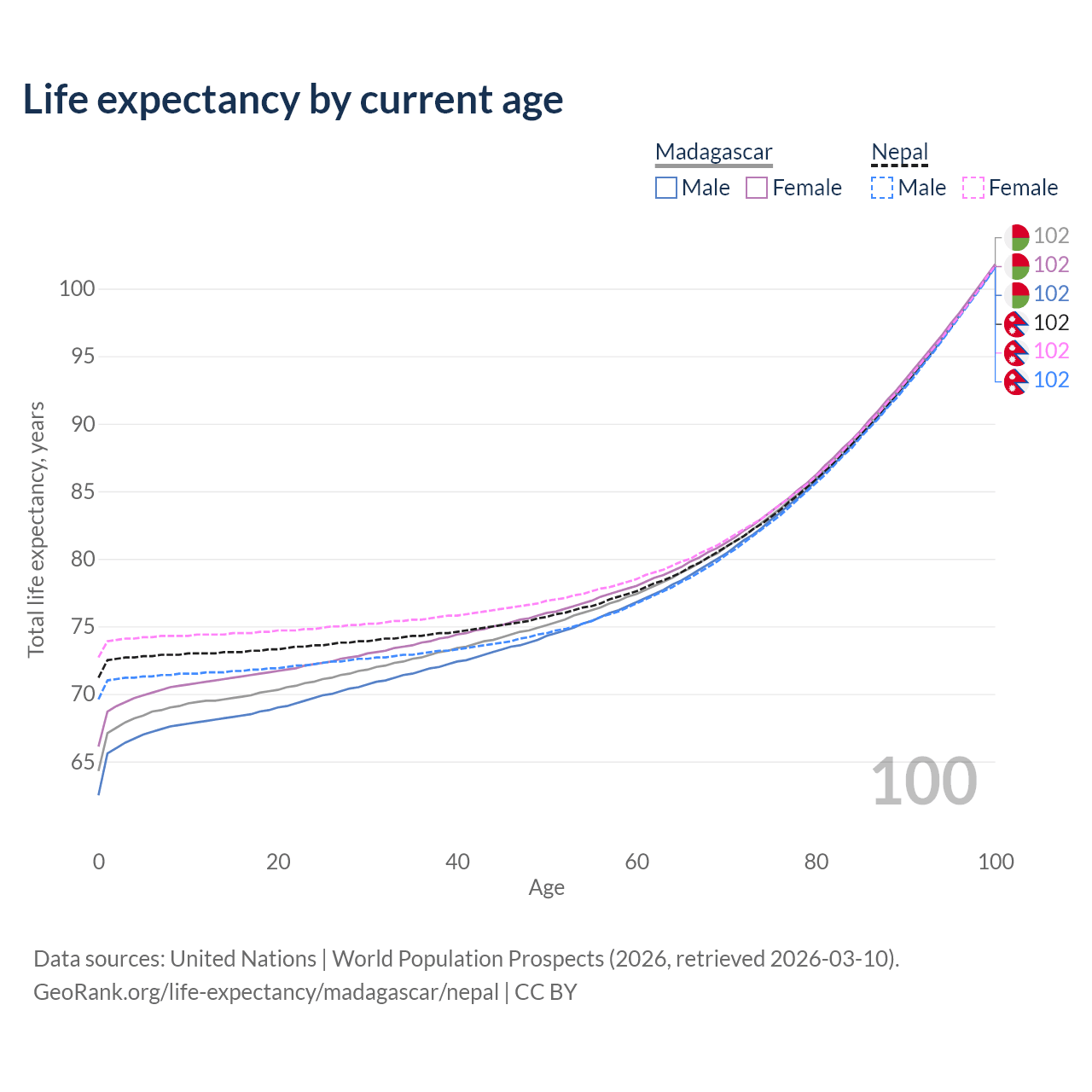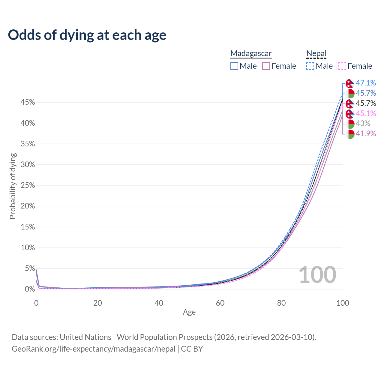 This life expectancy calculator shows the odds of living to 100, 95, 90, and below based on current age for both males and females in Madagascar and Nepal, along with mean and median age of death. The calculations are based on the 2026 life tables (actuarial tables) from the UN World Population Prospects.