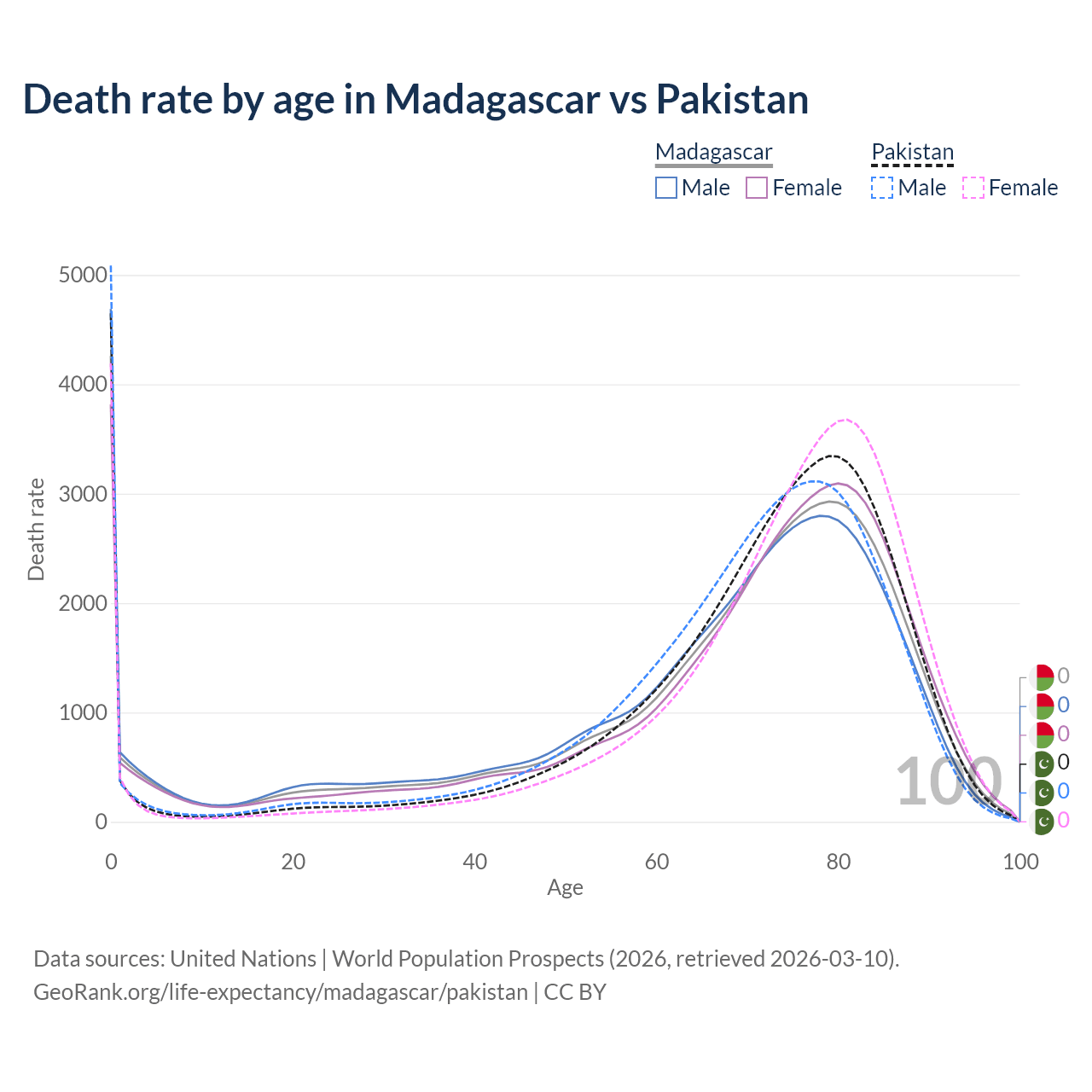 In Madagascar, the most common age of death is 0, compared to 0 in Pakistan. The median age of death is 72.2 in Madagascar and 74.3 in Pakistan, meaning only half of each cohort is expected to live past that age.