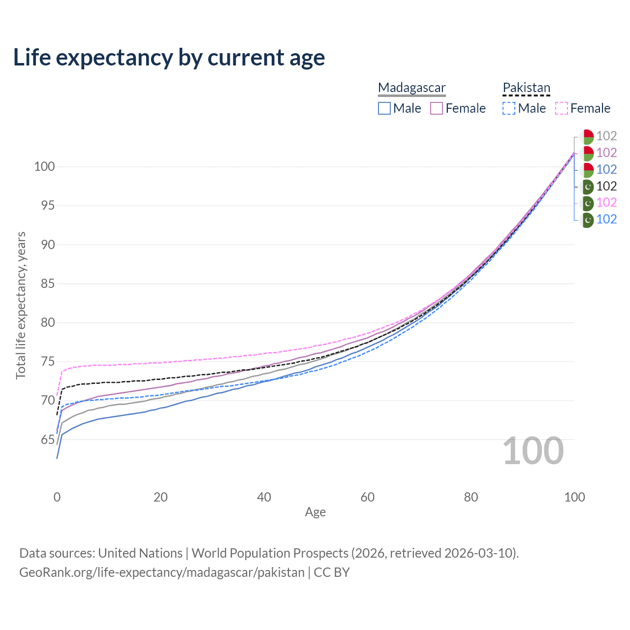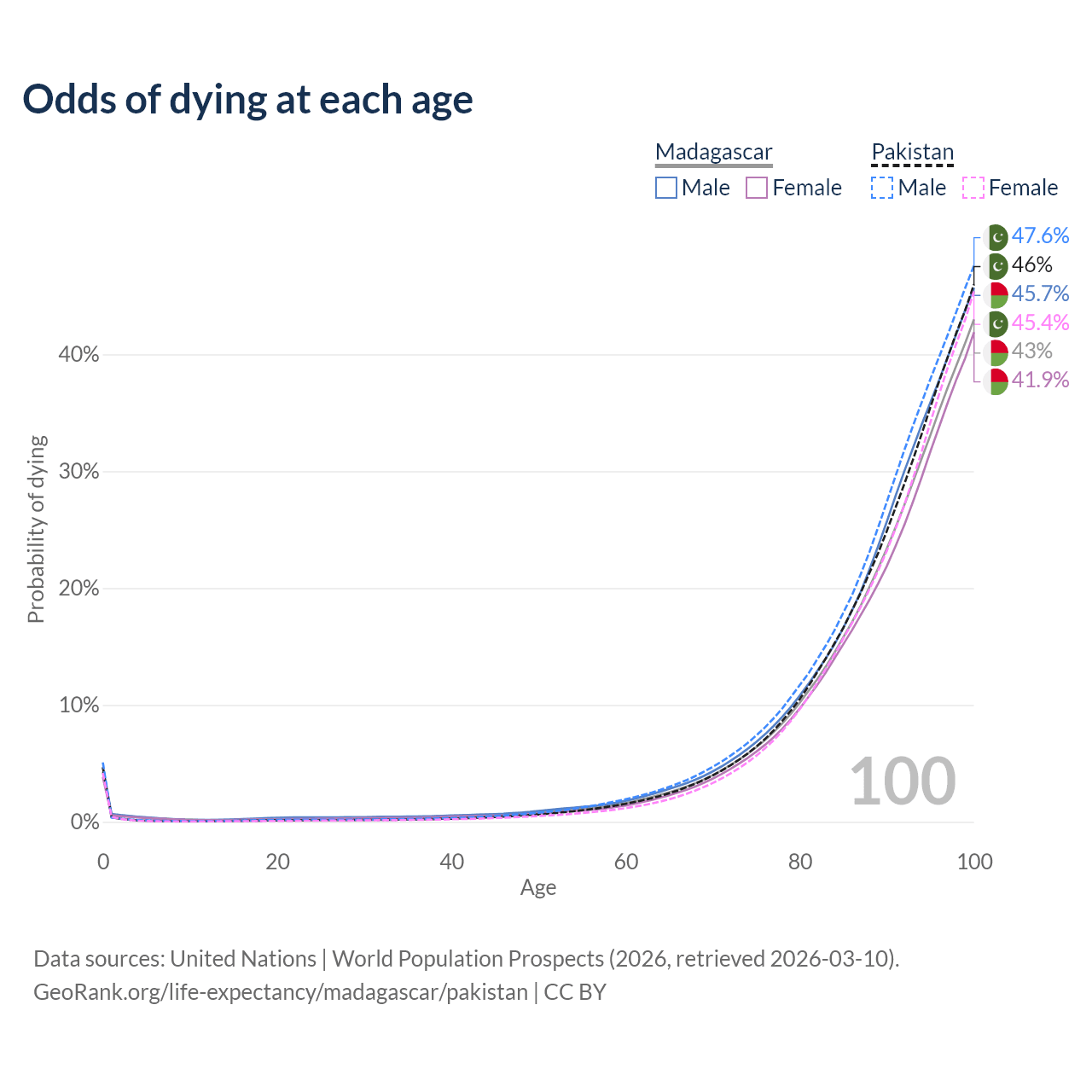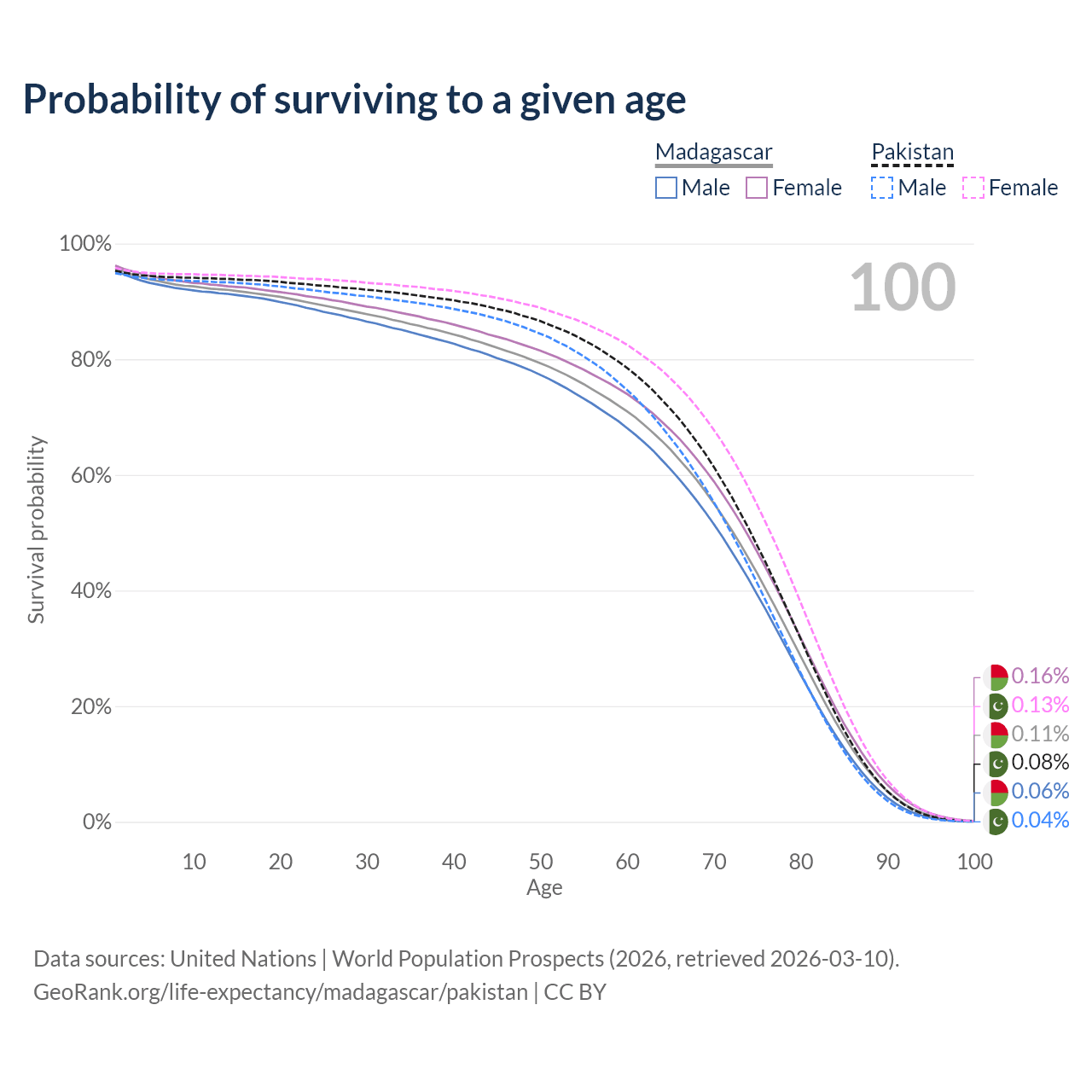 This life expectancy calculator shows the odds of living to 100, 95, 90, and below based on current age for both males and females in Madagascar and Pakistan, along with mean and median age of death. The calculations are based on the 2026 life tables (actuarial tables) from the UN World Population Prospects.