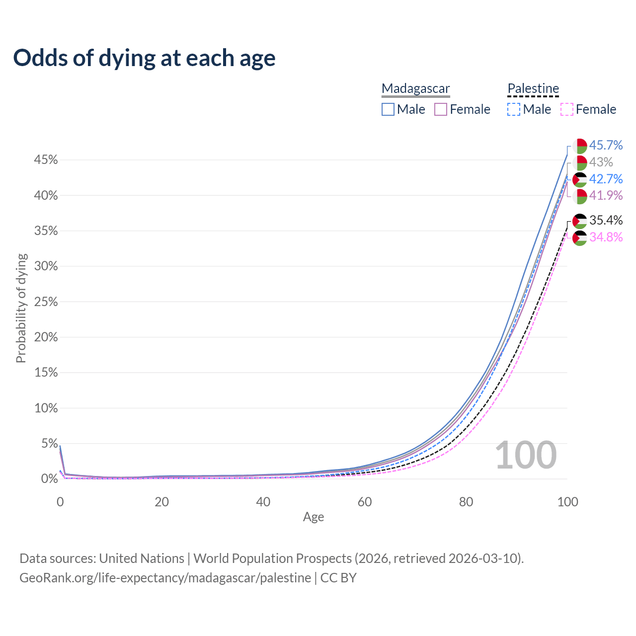 This life expectancy calculator shows the odds of living to 100, 95, 90, and below based on current age for both males and females in Madagascar and Palestine, along with mean and median age of death. The calculations are based on the 2026 life tables (actuarial tables) from the UN World Population Prospects.