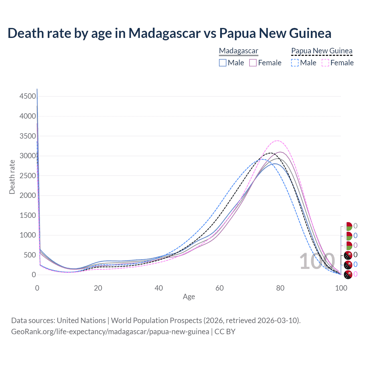 In Madagascar, the most common age of death is 0, compared to 0 in Papua New Guinea. The median age of death is 72.2 in Madagascar and 71.7 in Papua New Guinea, meaning only half of each cohort is expected to live past that age.