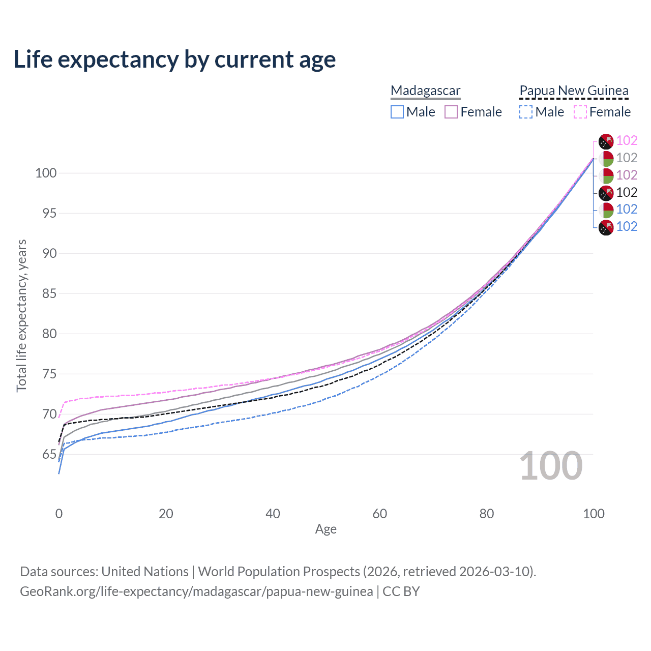 This life expectancy calculator shows the odds of living to 100, 95, 90, and below based on current age for both males and females in Madagascar and Papua New Guinea, along with mean and median age of death. The calculations are based on the 2026 life tables (actuarial tables) from the UN World Population Prospects.