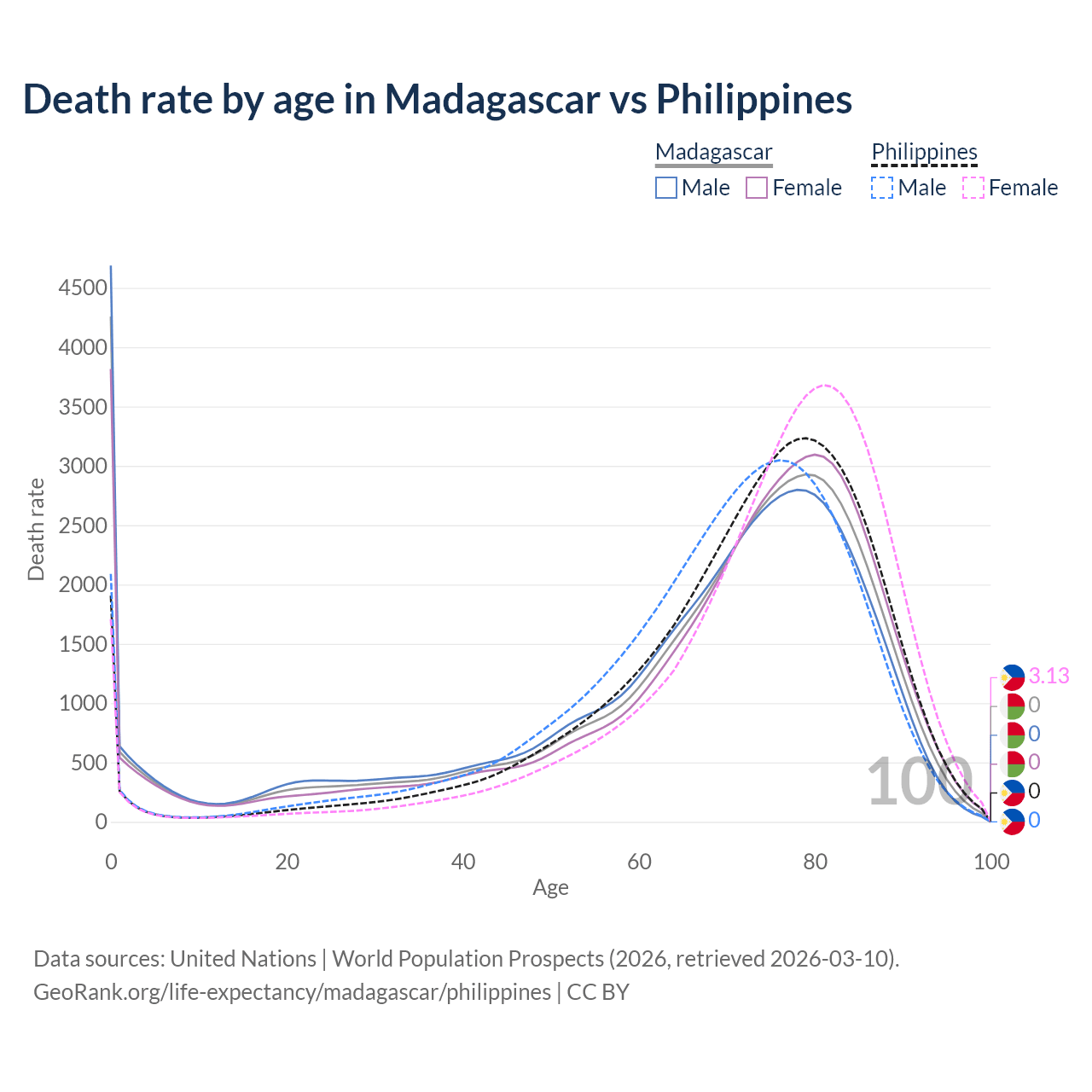 In Madagascar, the most common age of death is 0, compared to 79 in the Philippines. The median age of death is 72.2 in Madagascar and 74.6 in the Philippines, meaning only half of each cohort is expected to live past that age.
