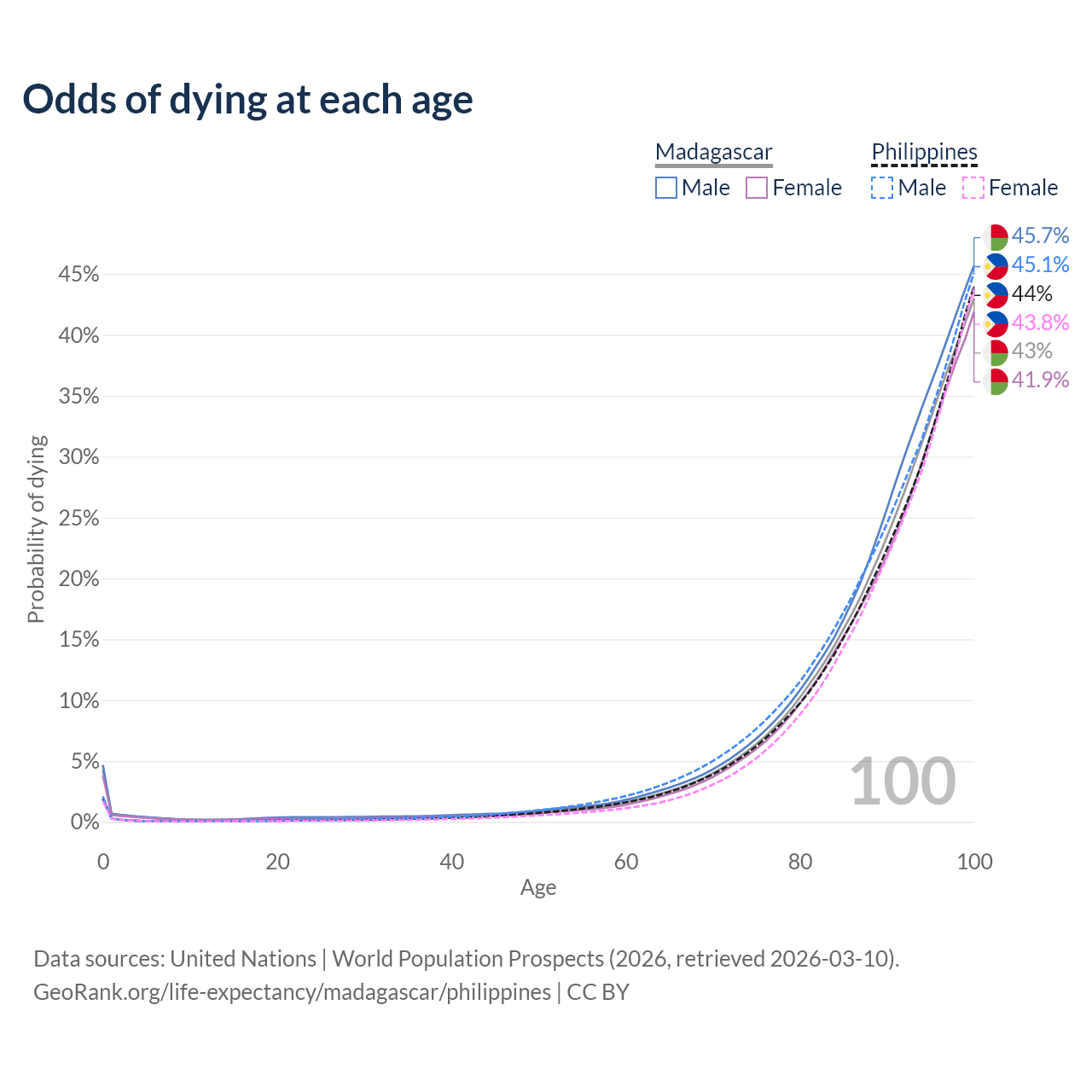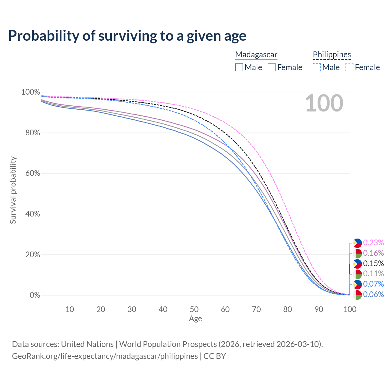 This life expectancy calculator shows the odds of living to 100, 95, 90, and below based on current age for both males and females in Madagascar and the Philippines, along with mean and median age of death. The calculations are based on the 2026 life tables (actuarial tables) from the UN World Population Prospects.