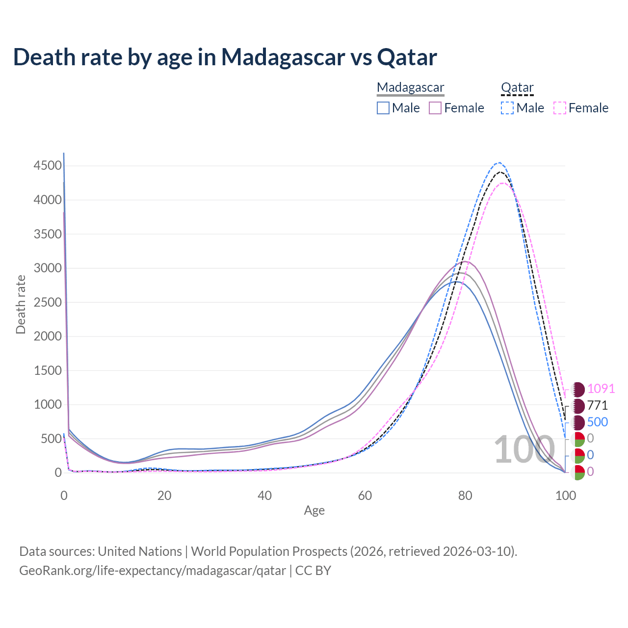 In Madagascar, the most common age of death is 0, compared to 87 in Qatar. The median age of death is 72.2 in Madagascar and 85.1 in Qatar, meaning only half of each cohort is expected to live past that age.