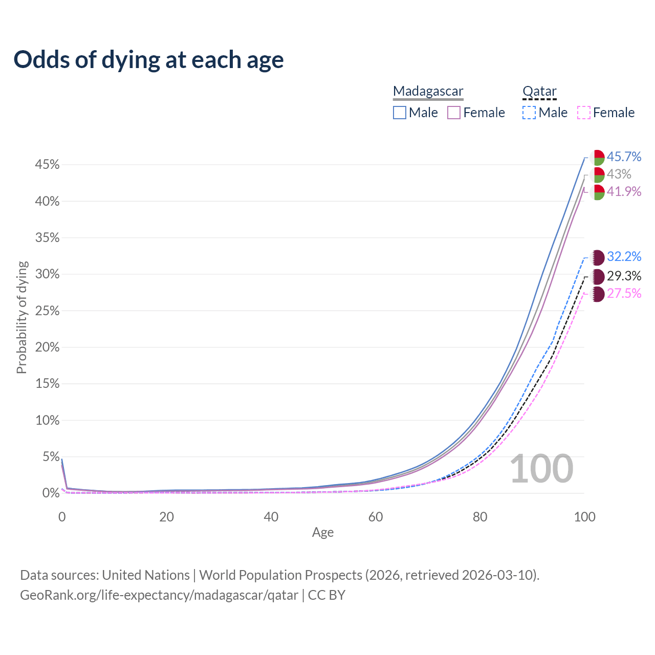 This life expectancy calculator shows the odds of living to 100, 95, 90, and below based on current age for both males and females in Madagascar and Qatar, along with mean and median age of death. The calculations are based on the 2026 life tables (actuarial tables) from the UN World Population Prospects.