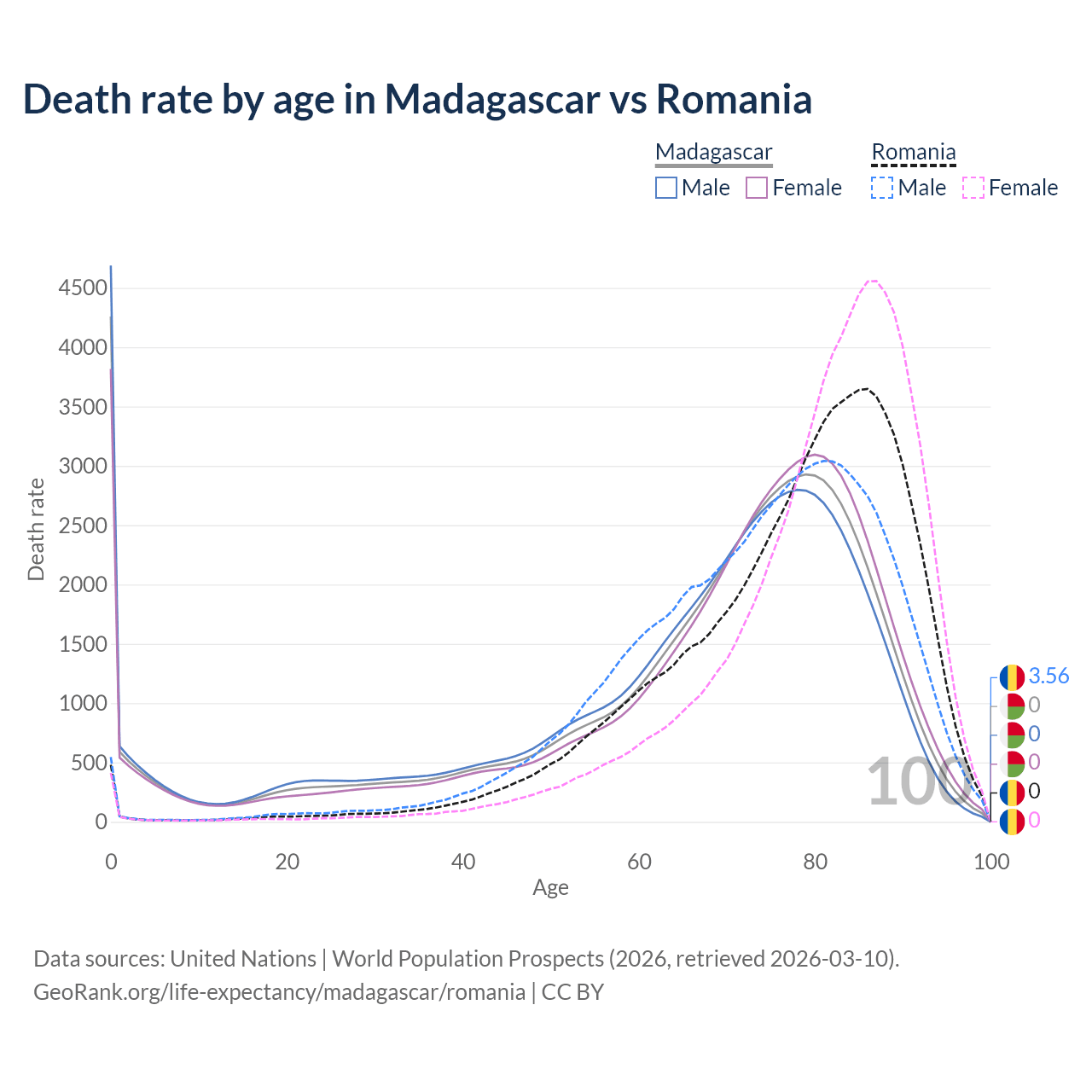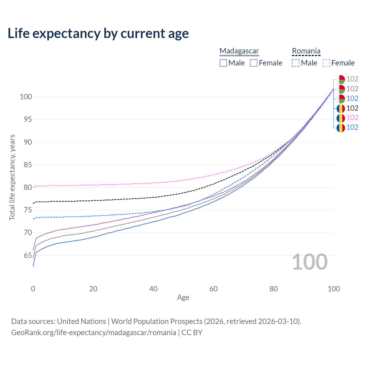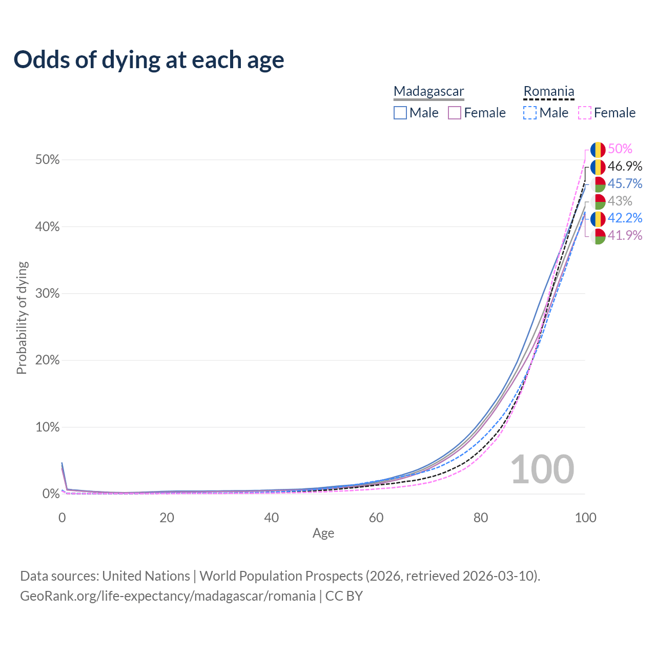 This life expectancy calculator shows the odds of living to 100, 95, 90, and below based on current age for both males and females in Madagascar and Romania, along with mean and median age of death. The calculations are based on the 2026 life tables (actuarial tables) from the UN World Population Prospects.