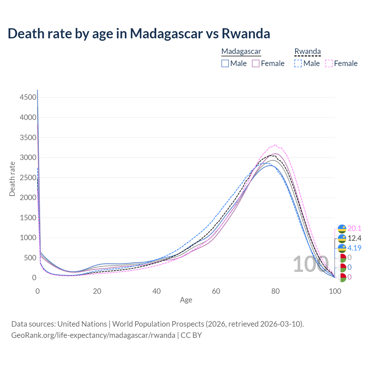 In Madagascar, the most common age of death is 0, compared to 78 in Rwanda. The median age of death is 72.2 in Madagascar and 73.5 in Rwanda, meaning only half of each cohort is expected to live past that age.