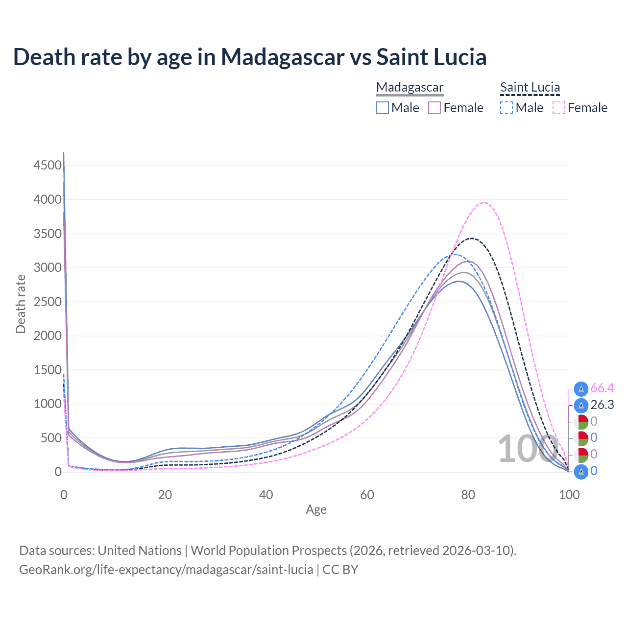 In Madagascar, the most common age of death is 0, compared to 81 in Saint Lucia. The median age of death is 72.2 in Madagascar and 76.8 in Saint Lucia, meaning only half of each cohort is expected to live past that age.