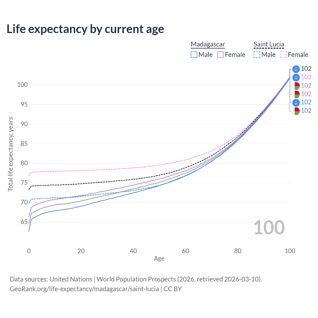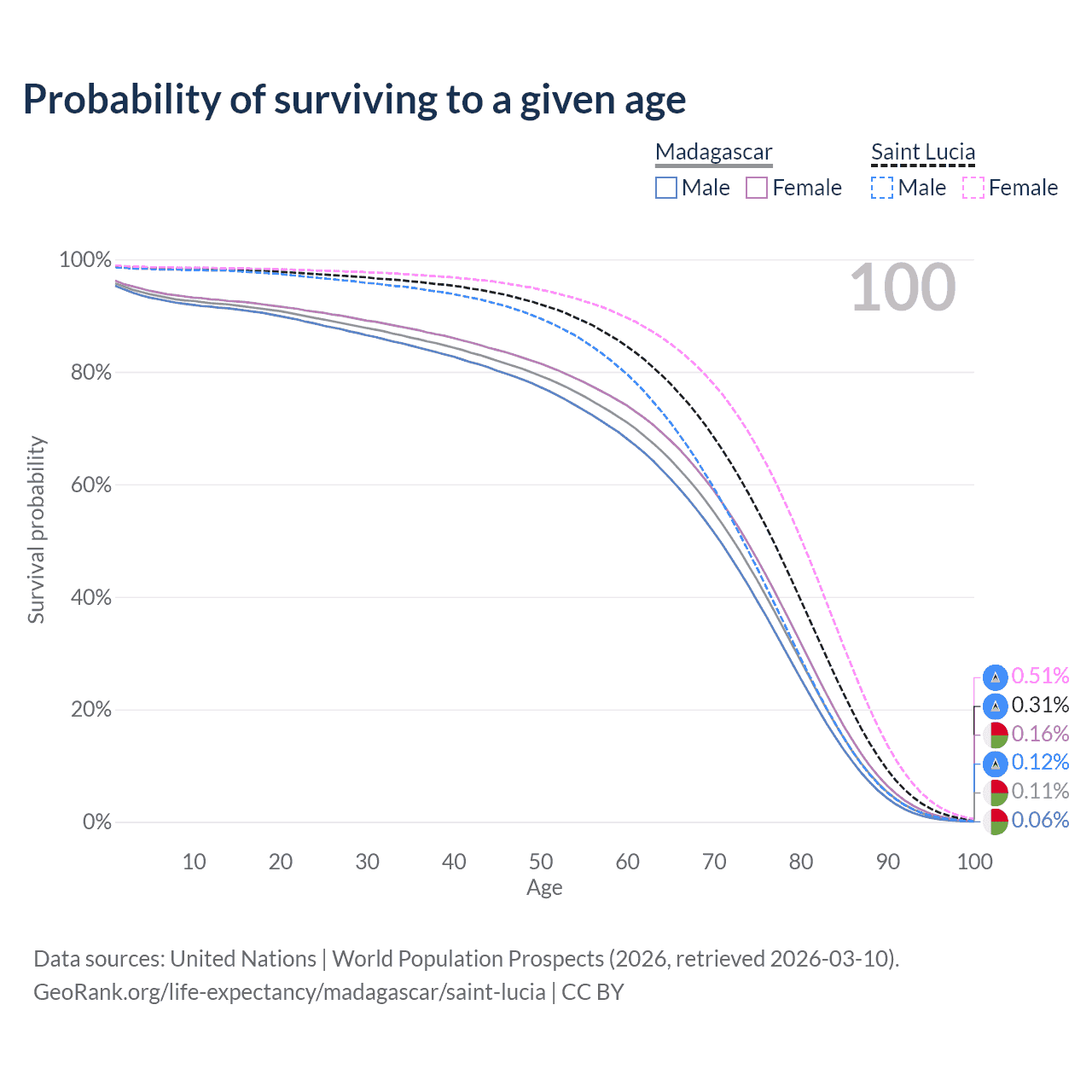 This life expectancy calculator shows the odds of living to 100, 95, 90, and below based on current age for both males and females in Madagascar and Saint Lucia, along with mean and median age of death. The calculations are based on the 2026 life tables (actuarial tables) from the UN World Population Prospects.