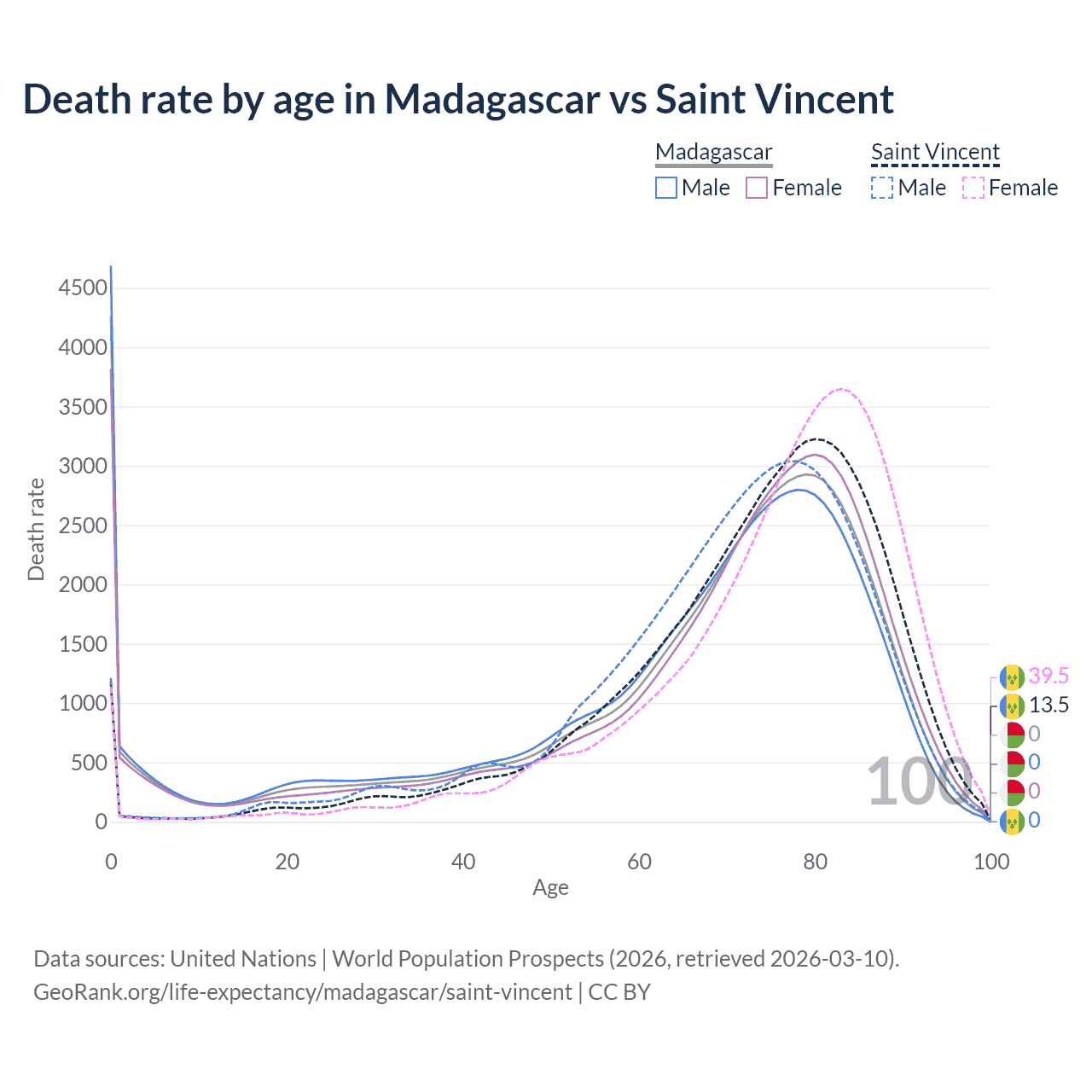 In Madagascar, the most common age of death is 0, compared to 80 in Saint Vincent. The median age of death is 72.2 in Madagascar and 75.6 in Saint Vincent, meaning only half of each cohort is expected to live past that age.