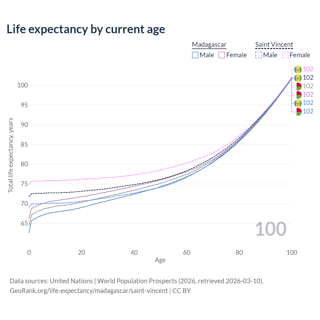 This life expectancy calculator shows the odds of living to 100, 95, 90, and below based on current age for both males and females in Madagascar and Saint Vincent, along with mean and median age of death. The calculations are based on the 2026 life tables (actuarial tables) from the UN World Population Prospects.
