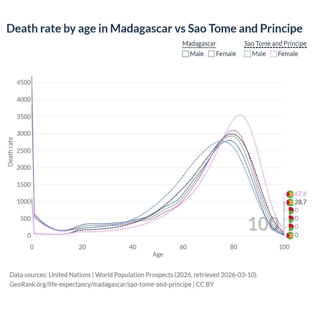 In Madagascar, the most common age of death is 0, compared to 79 in Sao Tome and Principe. The median age of death is 72.2 in Madagascar and 74.1 in Sao Tome and Principe, meaning only half of each cohort is expected to live past that age.