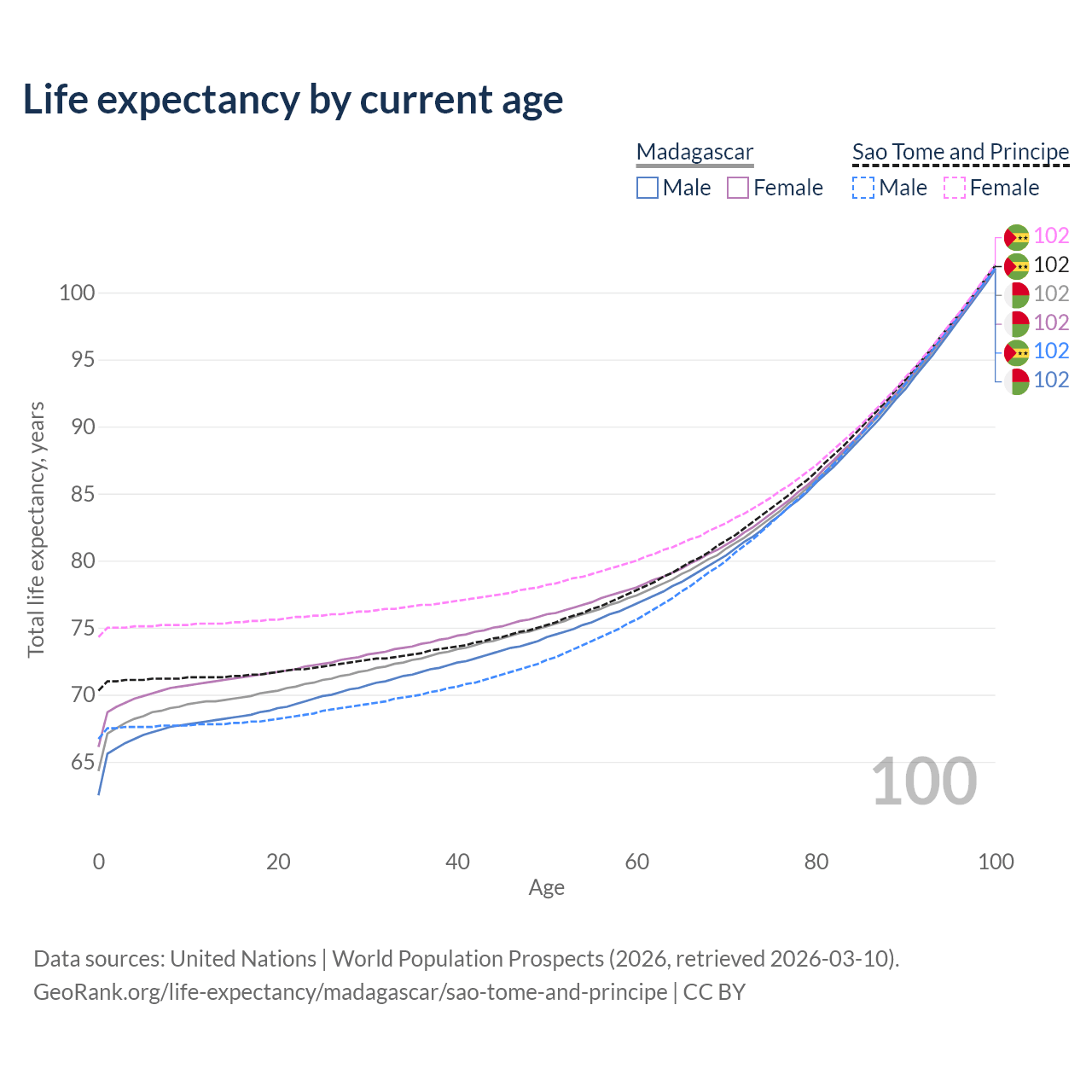 This life expectancy calculator shows the odds of living to 100, 95, 90, and below based on current age for both males and females in Madagascar and Sao Tome and Principe, along with mean and median age of death. The calculations are based on the 2026 life tables (actuarial tables) from the UN World Population Prospects.