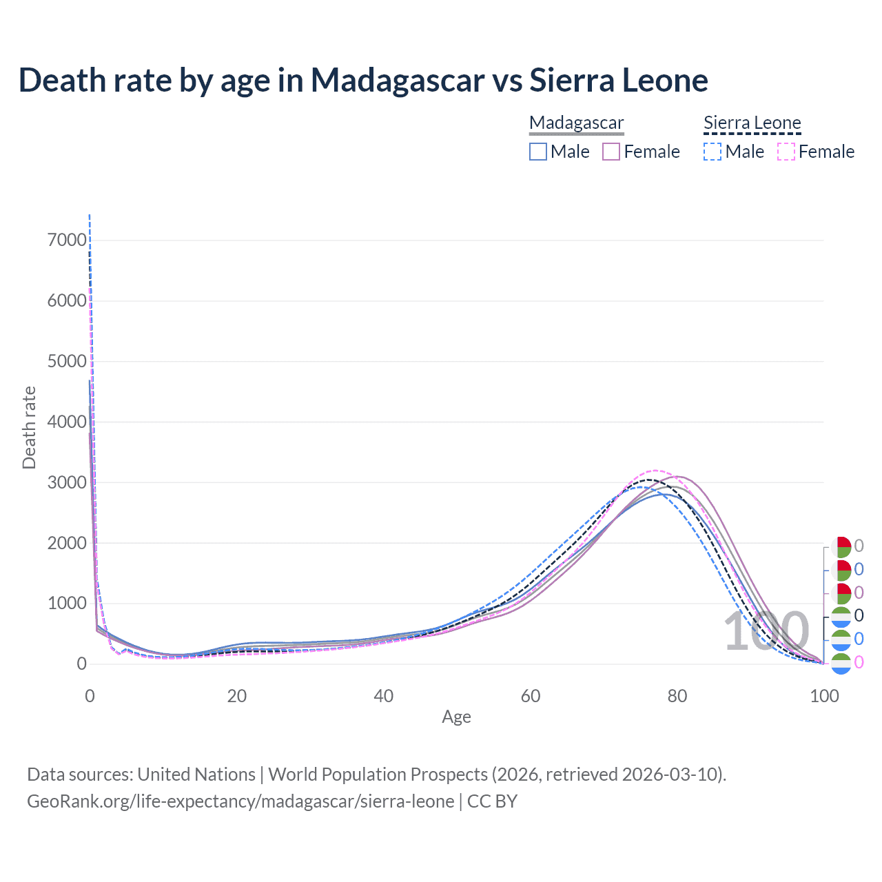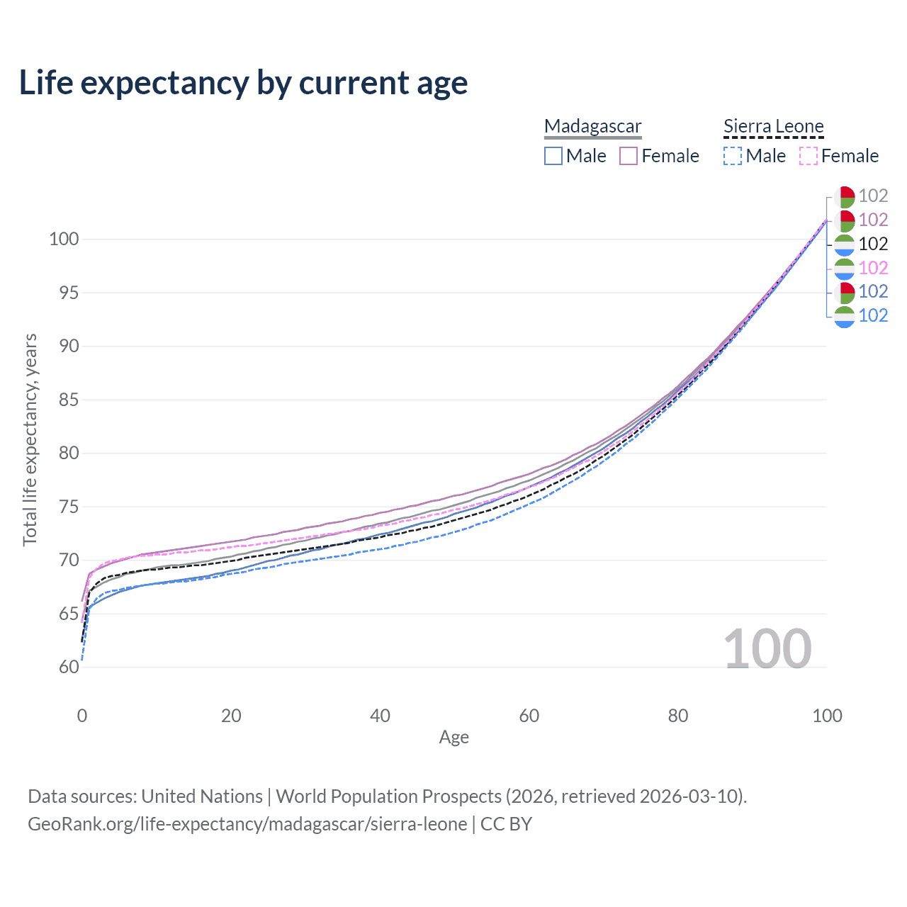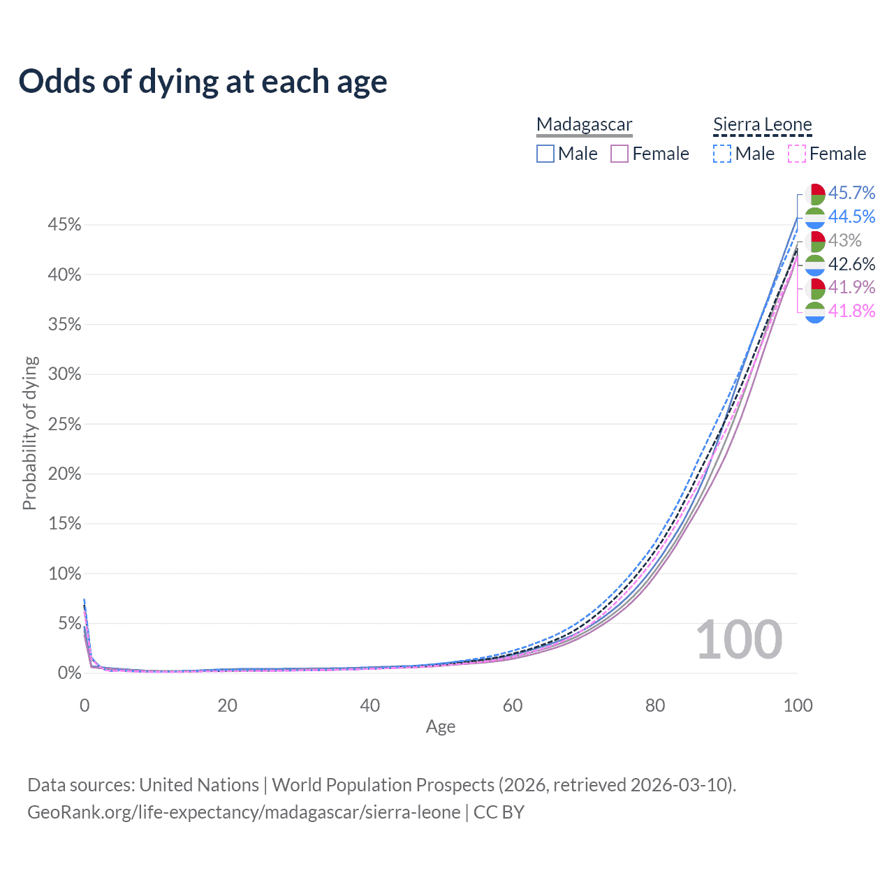 This life expectancy calculator shows the odds of living to 100, 95, 90, and below based on current age for both males and females in Madagascar and Sierra Leone, along with mean and median age of death. The calculations are based on the 2026 life tables (actuarial tables) from the UN World Population Prospects.