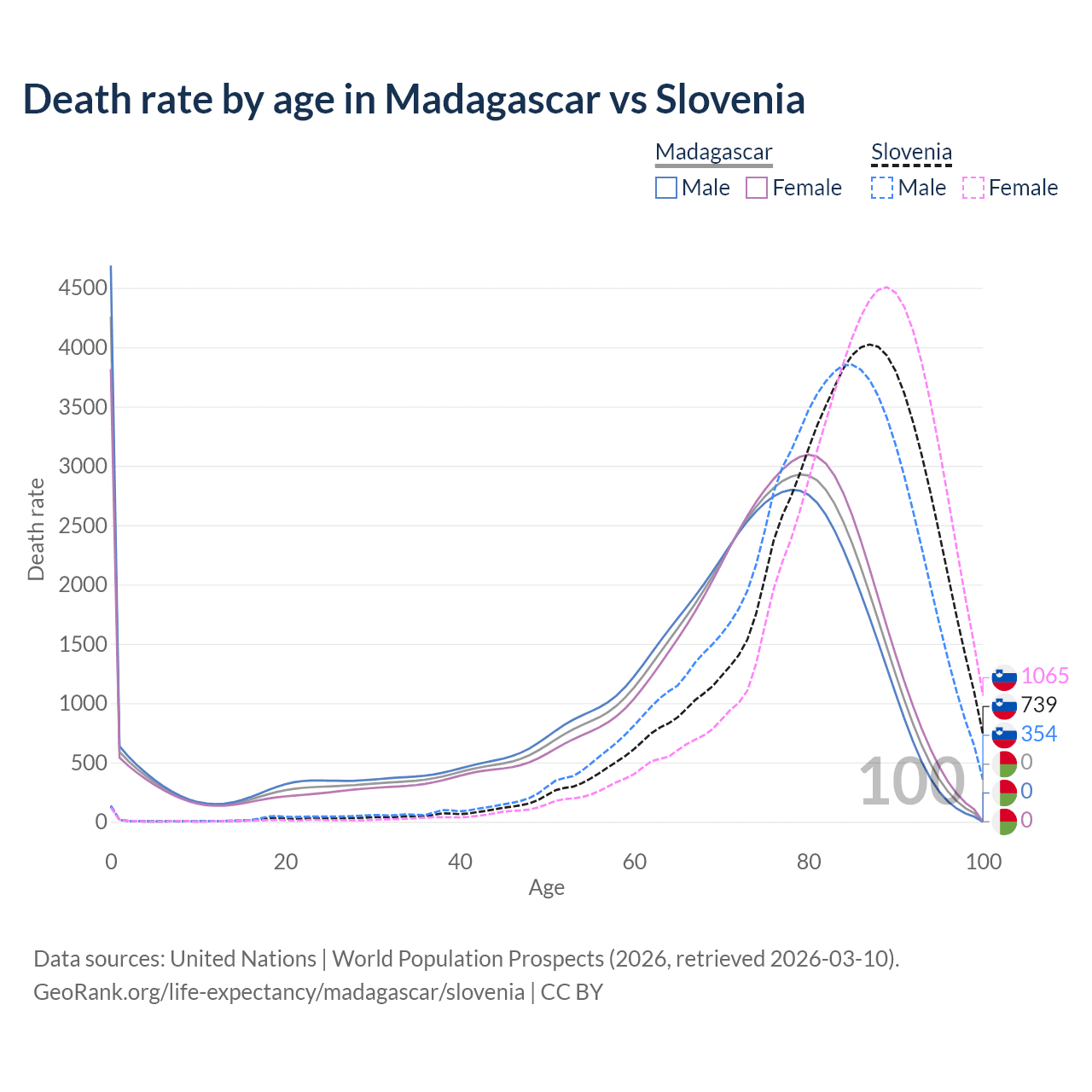 In Madagascar, the most common age of death is 0, compared to 87 in Slovenia. The median age of death is 72.2 in Madagascar and 84.4 in Slovenia, meaning only half of each cohort is expected to live past that age.