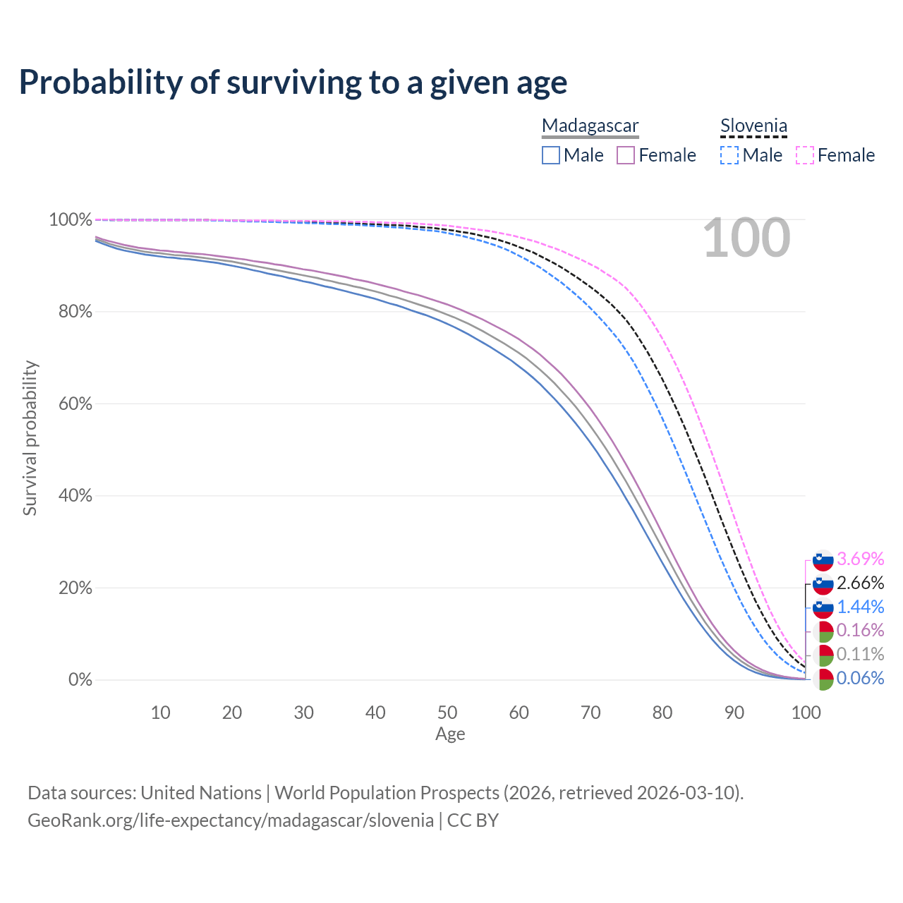 This life expectancy calculator shows the odds of living to 100, 95, 90, and below based on current age for both males and females in Madagascar and Slovenia, along with mean and median age of death. The calculations are based on the 2026 life tables (actuarial tables) from the UN World Population Prospects.